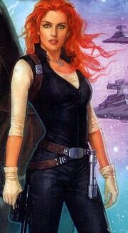 Following the death of the Emperor, Jade Skywalker found herself on the run from Director Ysanne Isard; however, she managed to escape, disguising herself as a refugee.[15] During her days as a smuggler, Jade Skywalker often employed her spy abilities for Talon Karrde—she participated in a mission for Karrde to track down Jorj Car'das, where she maximized her infiltration skills to complement her spy abilities.[42] Jade Skywalker's colored life reinforced the skills she needed to be a successful spy. During the outbreak of the Confederation-Galactic Alliance War, Jade Skywalker's son Ben would brag about her abilities as a spy to Jedi Knight Nelani Dinn.[74] During the Confederation-Galactic Alliance war of 40 ABY, she used her talents as a spy to track and watch Jacen, eventually following him to Hapes, where he was visiting his lover Tenel Ka and his daughter Allana.[2]