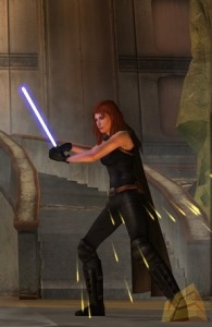 Noting the passageway was mined with explosives, Jade used an alien corpse to set off the explosives as a distraction while she worked her way along an overhead crane arm. Meanwhile, LaRone's contact, actually Rebel pilot Luke Skywalker, made his own attempt to free the governor's family. He came under fire after subduing some of the guards with his lightsaber and Jade tossed him her weapon. She then drew fire, deflecting it with her lightsaber as she closed on the cabin where the governor's family was being held. Skywalker helped fight off the guards while Jade freed Ferrouz's wife and daughter. As Esva's forces closed in, Jade ordered Skywalker to shoot a pool of flammable liquid she had spilled to cover their escape. The resulting explosion and Jade's skills dealt with the rest of the guards. Meanwhile, the Hand of Judgment fended off Esva's forces and an Imperial fleet destroyed the warlord's navy.[14]