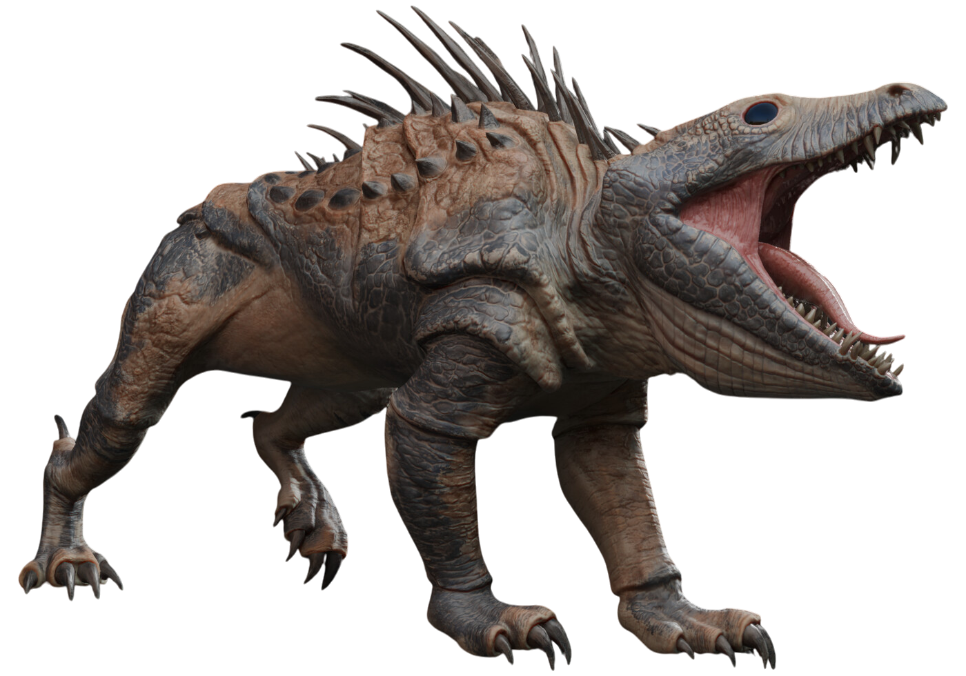 A massiff was a squat quadruped with a row of spines along their humped backs.[5] The size of the spines, which the reptiles used for defense, indicated a massiff's age.[2] As well as the spines giving them an extra level of defense,[3] the creatures also had armored hides.[2] Native to desert environments, massiffs were snarling hunters with powerful and dangerous bites.[3] Their mouths could open very wide and were filled with long dagger-like teeth.[7] The creature's large eyes allowed it to see well at night[3] and in the dark in general.[2] An average massiff stood at roughly one meter high, and the species was found on a variety of worlds, typically in desert habitats such as Tatooine, Geonosis,[3] and Florrum.[6]