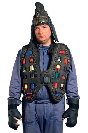 During the race, Rags wore a blue worksuit with a black utility tool vest, black gloves, brown boots, and pointed brown cowl with a pair of goggles. They had blue eyes and light skin.[1]