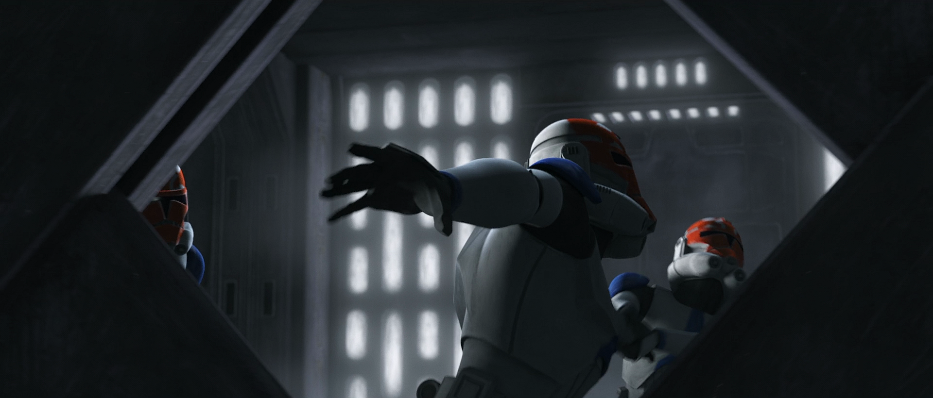 Maul pulls a clone trooper towards him to sever the soldier's arm in a closing door