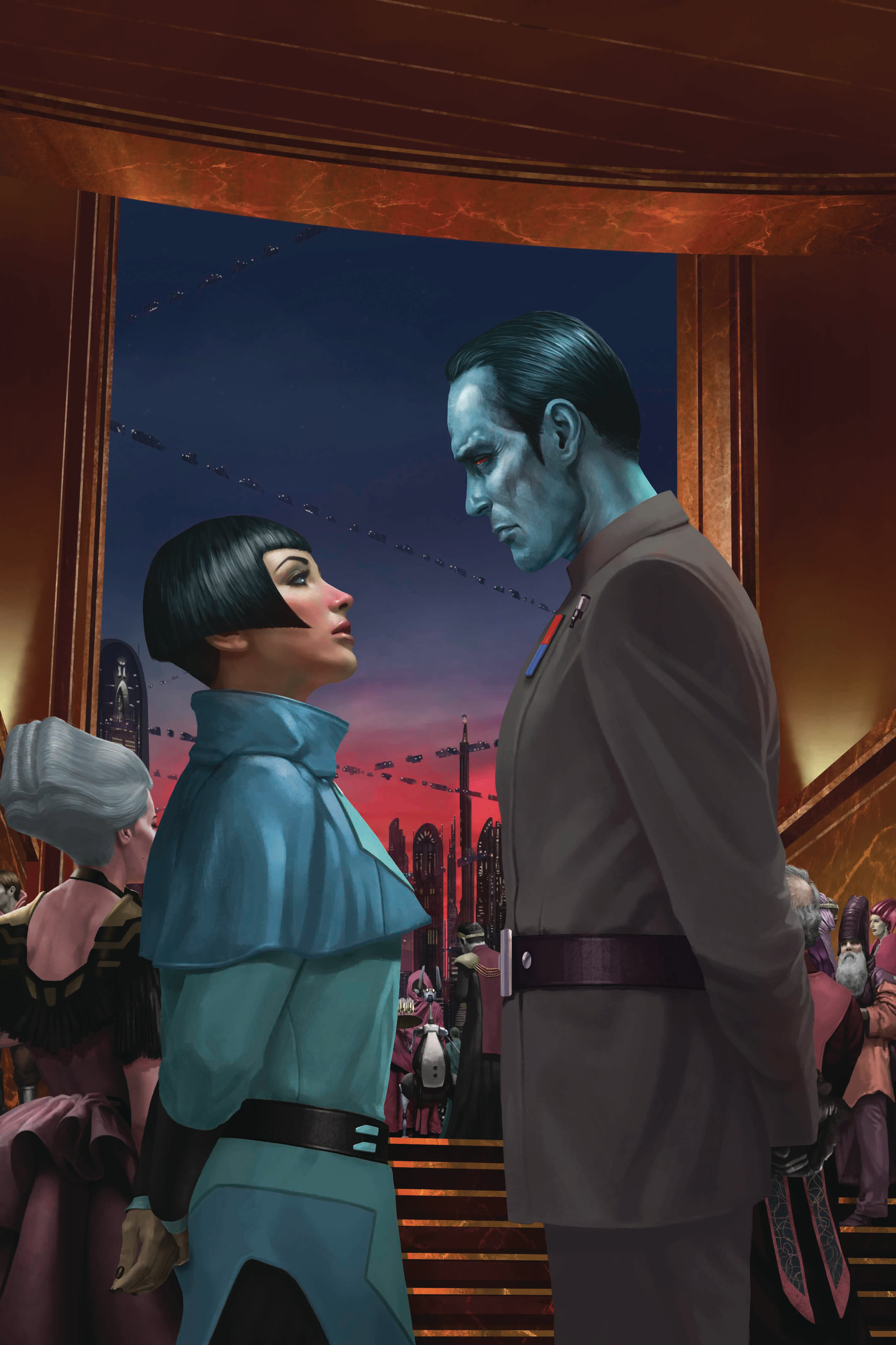 Thrawn left Thrass to eat at the rematching dinner and perform the ceremony. Thrass continued to observe Thrawn through the rest of the rematching dinner, watching Thrawn draw back from social interactions, mainly speak when spoken to, and observe everything around him. Thrass decided to converse more with the young cadet Thrawn, who seemed uncomfortable. Understanding Thrawn's interest in art, Thrass offered to show the cadet the large collection of artwork available at the compound on Avidich. Aristocra Thrass asked Thrawn how long he would stay on Avidich, to which Thrawn replied that he had only been permitted to stay on Avidich for one night. Thrass sought to extend Thrawn's time on the planet, predicting that Thrawn would only receive two or three downmarks for staying longer, and insisting that the Mitth family could have the downmarks waived. However, Thrawn informed Thrass that he had already accrued fifty downmarks, leading Thrass to question how Thrawn could have possibly earned so many demerits. Thrawn was surprised he had even been allowed to travel to Avidich at that time rather than waiting a few weeks, but Thrass pointed out the political concerns that had enabled Thrawn's presence that night: Avidich's Irizi family Patriel was present at the rematching dinner. The Irizi family was rivaled to the Mitth, and had a goal of dominating the Ascendancy military including Ba'kif's new Expansionary Defense Fleet. Mitth family Patriarch Thooraki wished to show off three military rematches to the Irizi rather than two, and had thus appealed to Colonel Wevary, Taharim Academy's leader, to allow Thrawn a one-day travel pass to Avidich. Understanding that Thrawn had to return to Naporar soon, Thrass offered to show Thrawn the Patriel's art collection, and described the art gallery at the Mitth family homestead on Csilla as even grander. Thrawn declined Thrass' offer, but said he'd like to examine art with the Aristocra someday.[11]