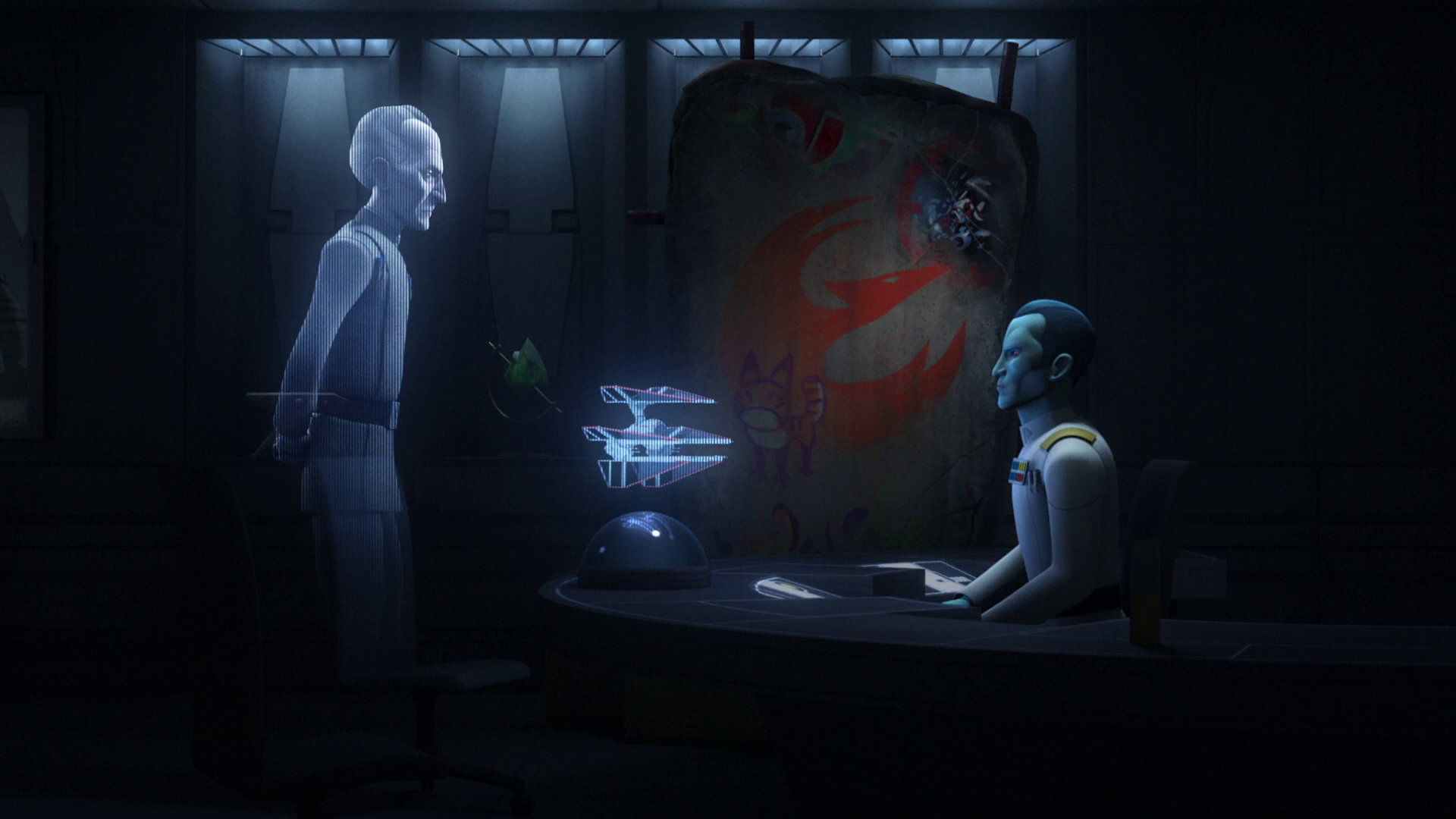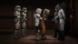 Despite serving on opposing sides in the Galactic Civil War, Thrawn maintained a cordial and professional respect for Twi'lek Hera Syndulla. Thrawn admired Syndulla's leadership and piloting skills, believing her to be a shrewd and intelligent leader. The Chiss Grand Admiral took leadership of the Imperial occupation of the Twi'lek homeworld of Ryloth, further occupying the Syndulla family residence in Tann Province as the Imperial base of operations for the planet. In the process, he stole and revered the Syndulla family's kalikori, a revered Twi'lek heirloom passed from parent to child detailing and honoring the history of the family. Hera infiltrated her family's home under the guise of a local servant, stealing back her family's kalikori from Thrawn. Thrawn was able to determine that she was indeed Hera Syndulla based on her reverence for the totem, retaking the heirloom and promising the Twi'lek woman that he would honor it among his art collection. After Hera destroyed her own family's home during a prisoner exchange on Ryloth, Thrawn accepted that the Imperials had been outmaneuvered and insisted that they should allow the rebels their victory, despite the protests of Captain Slavin.[8]