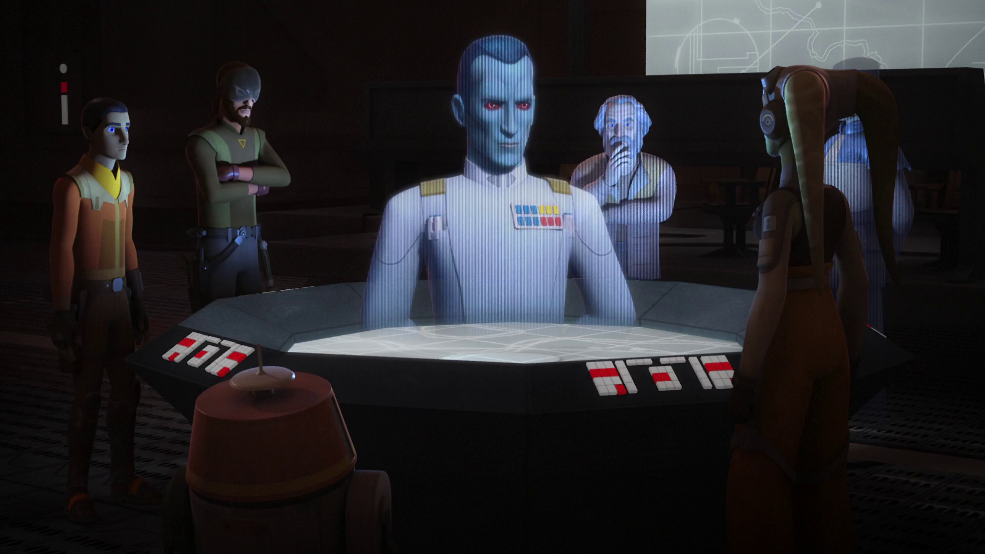 In an effort to find the location of Chopper Base, Thrawn set a trap for Kallus by revealing that his spies were aware that the rebels were planning to attack Lothal. Cross-referencing his knowledge of ancient art with the trajectories of Dodonna's Massassi Group and Kallus' Fulcrum transmissions, Thrawn deduced that Chopper Base was in the Atollon system. As a career officer, Thrawn was not interested in personal glory but was only concerned with yielding results for his Emperor. His interest in the bigger game irked Konstantine, who was only interested in personal glory. Thrawn was angered by Konstantine's incompetence, as his folly ruined Thrawn's chance of crushing the rebellion once and for all.[49]