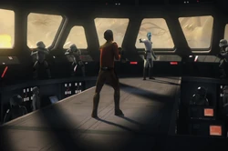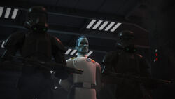 Due to his combat experience, Thrawn was unfazed when Ezra and Sabine flew their stolen TIE Defender Elite inches above him. Maintaining a steely resolve, Thrawn instead fired back. Thrawn was not upset by the loss of the TIE/D Defender Elite prototype and instead used the rebels' theft as an opportunity to test the fighter's flight capabilities and weapons systems against TIE/IN Interceptors.[56] Thrawn's growing frustration with Governor Pryce's inability to capture the Spectres and Ryder Azadi's cell and stop the theft of the TIE/D Defender Elite led him to dispatch the Noghri assassin Rukh to hunt down and eliminate the insurgents.[6]