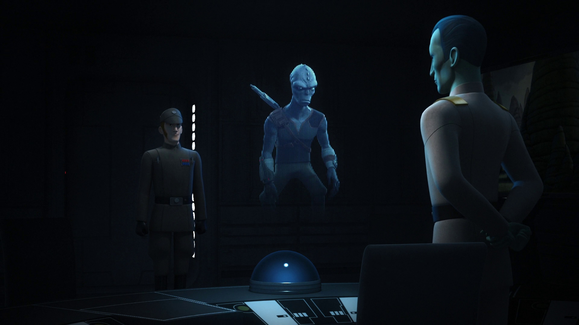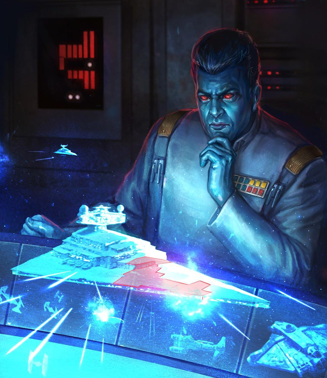 Mitth'raw'nuruodo, born as Kivu'raw'nuru with the core name Vurawn, recognized in his early military career as Mitth'raw'nuru, and better known by his core name Thrawn, was a Chiss male officer of the Chiss Ascendancy and Grand Admiral in the Imperial Navy during the age of the Galactic Empire. An alien Imperial officer with striking blue skin, red eyes, and an angular face, Thrawn was well known as a brilliant and ruthless strategist. He believed that in order to achieve victory in war, one must know their enemy. As such, he dedicated himself to understanding the philosophy, art, and culture of his opponents, which included the Twi'leks of Ryloth and the warriors of Mandalore. When Governor Arihnda Pryce requested a strong commander capable of defeating the rebels on Lothal, Grand Admiral Thrawn accepted the challenge, intending to dismantle the rebellion one piece at a time.