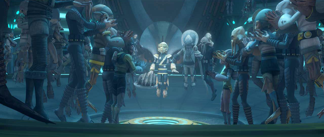 In order to regain the Quarren trust, the prince decided to free the prisoners so the prisoners could overtake the captors and unite the people of Mon Cala under one revolt. Meanwhile, Ri questioned the battle, to which Tamson announced that he planned to take the Mon Cala throne for himself, as part of an agreement with Dooku before the battle.[22]
