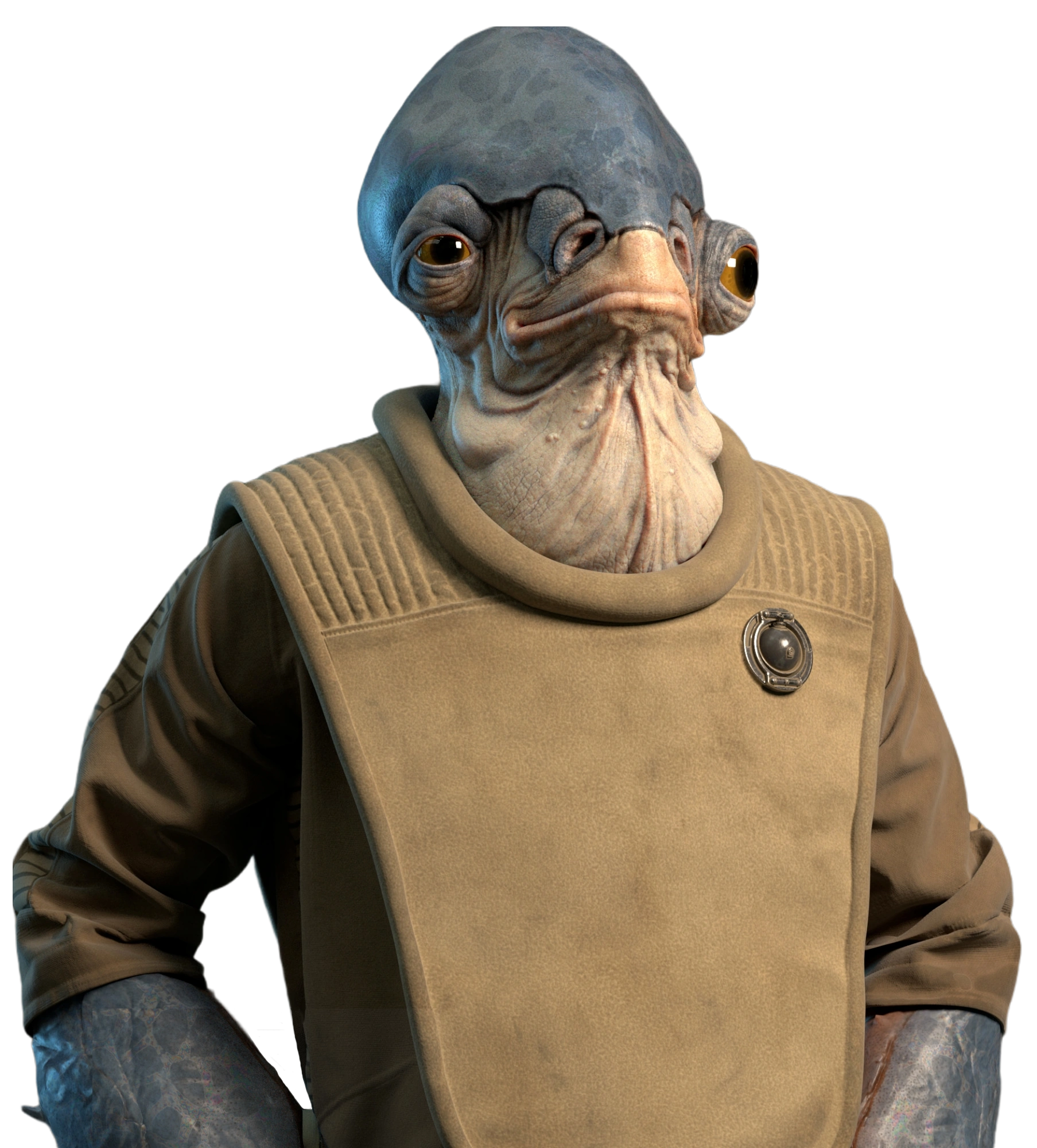 The Mon Calamari were a bipedal, amphibious species with high-domed heads, webbed hands and large, goggle-like eyes,[1] which stuck out from the sides of their head.[18] In addition to being webbed, the Mon Calamari hand presented three suction-cup like holes on its palm, and featured five claw-tipped fingers: one opposable thumb, two long middle fingers, and two very short outer fingers.[10] Although they were shaped like flippers,[5] their feet could nevertheless fit into boots designed for humanoid feet.[13] The females were distinguished from the males by their more prominent chest areas.[19] The Mon Calamari's skin faded from vibrant in their youth to more worn out as they got older. The individuals that hailed from the colder polar extremes of their planet were noticeably less colorful than those who came from the tropical zones.[4]