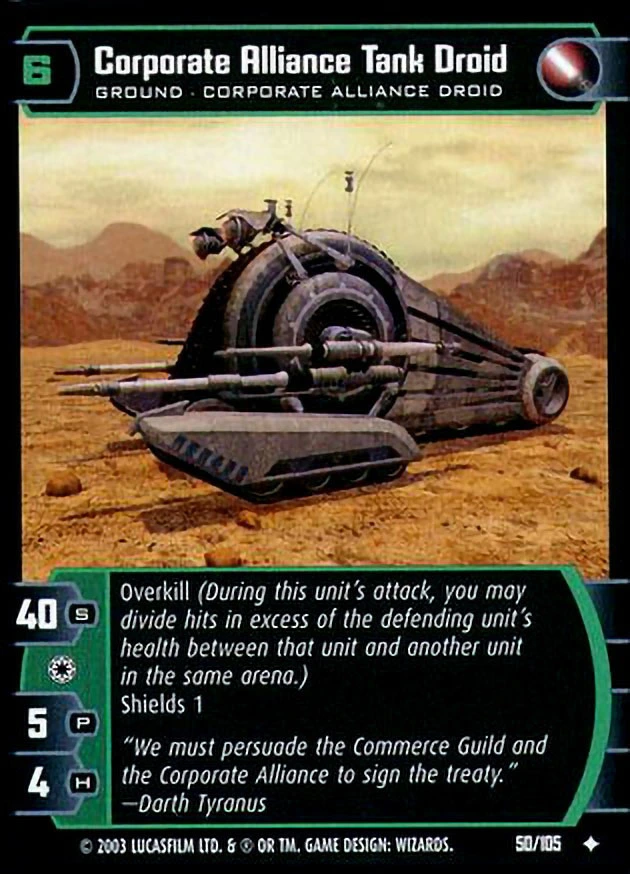 Before the Clone Wars, the tank droid was deployed by the Corporate Alliance against Outer Rim worlds that opposed its development plans or protested against its unfair business practices. It was one of the contributions of the Corporate Alliance to the droid armies of the Confederacy of Independent Systems.