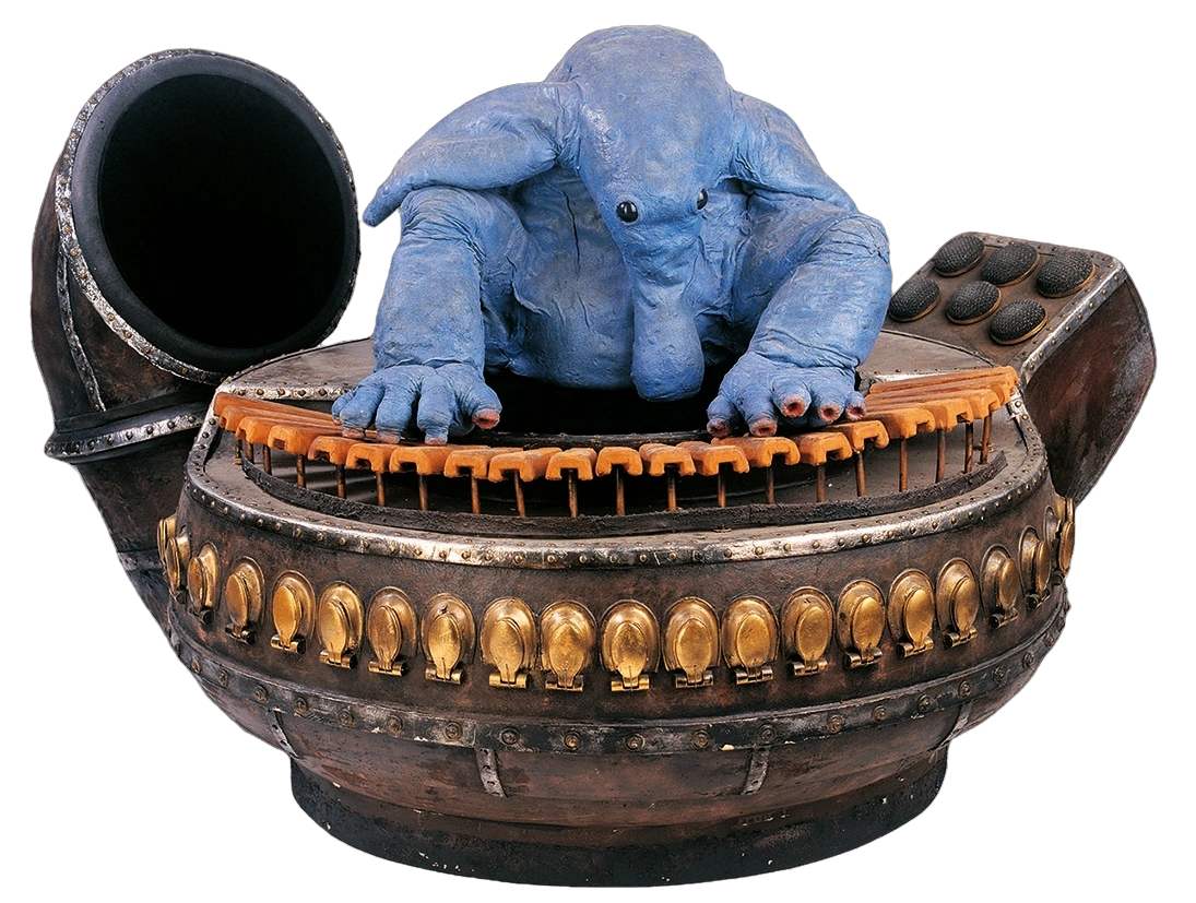 The Nalargon or Red Ball Jett keyboard was a keyboard instrument similar to an organ, and the signature instrument of Max Rebo.[source?] Circular in shape, the player—known as a Nalargonist[1]—would sit in the center of the instrument, depressing any combination of the 21 keys. Air intake was to the player's left, while the output speaker was on their right. Between the base of the organ and the keyboard were air outlet pipes.