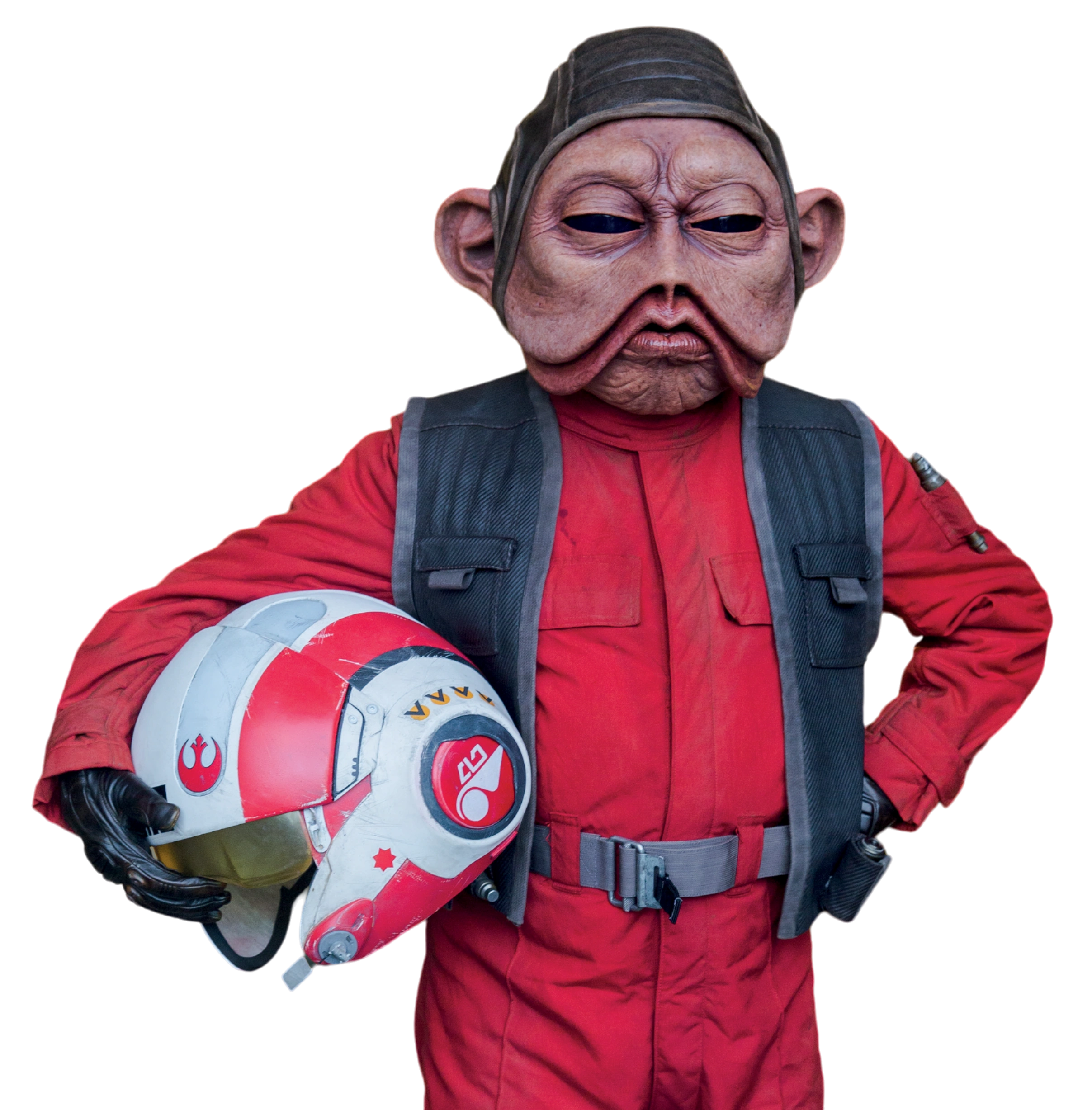 After joining the Resistance, Nunb offered his support and provided his skills by piloting a T-70 X-wing starfighter in the Resistance Starfighter Corps[11][21] having the naval rank of Lieutenant Commander.[22] He wore flight gauntlets, a pressurized interstellar orange g-suit, and a gear harness, along with a specialized flight helmet to fit his unique head.[6] His helmet also featured older Coalstreak Squadron stripes on the upper right-hand side of his helmet, appearing as two, parallel black lines.[21]
