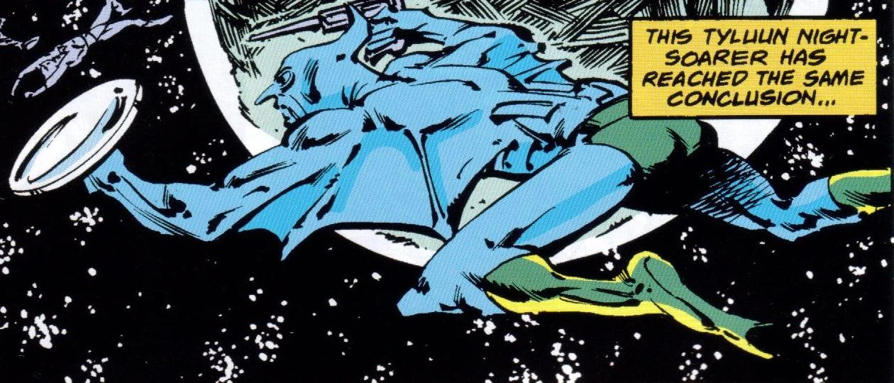 The Night-Soarers were a sentient species from the planet Tyluun. They were bipedal in form, and large wings extended from their ribcages and arms, making them capable of independent flight. Night-Soarers earned a reputation in the galaxy as assassins through their stealth and cunning. Some Night-Soarers participated in gladiatorial games, such as the Tandem Open on Jervo's World or death matches aboard The Wheel.