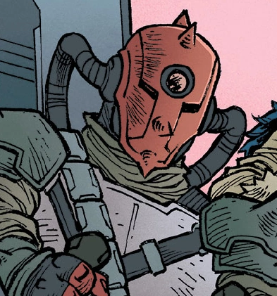 Finding his father bleeding on the floor of his quarters, Marchion learned that he had no idea who had attacked him. Disappointed at that, Marchion nonetheless then began to kick his downed father, continuing to do so after the man was dead.[12] When Asgar died, Marchion inherited the unfinished family goal and the title of Eye, including everything that went with the position.[5] He began his new role with a ceremony, during which he began his mission to unite the Nihil under his control; he called the Tempest Runners "his" and spoke of the group's rebirth, with Dee beginning to realize they had underestimated Marchion when the crowd began to chant in support.[19] As time passed, the three Tempest Runners would often see Marchion without his mask, but the features of his species always struck fear into them on an instinctive level.[5]