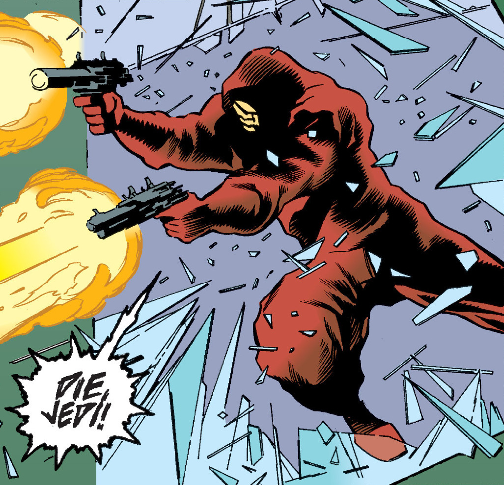 Later, after Satal found a transmission from Qel-Droma to some fellow Jedi professing he was there to break the Krath's power, the Krath leader ordered Norgor to assassinate the Jedi Knight. Norgor struck when Qel-Droma was in Aleema's bedchambers, jumping in through the window with two blasters firing. However, Norgor was cut down by the lightsaber-wielding Qel-Droma.