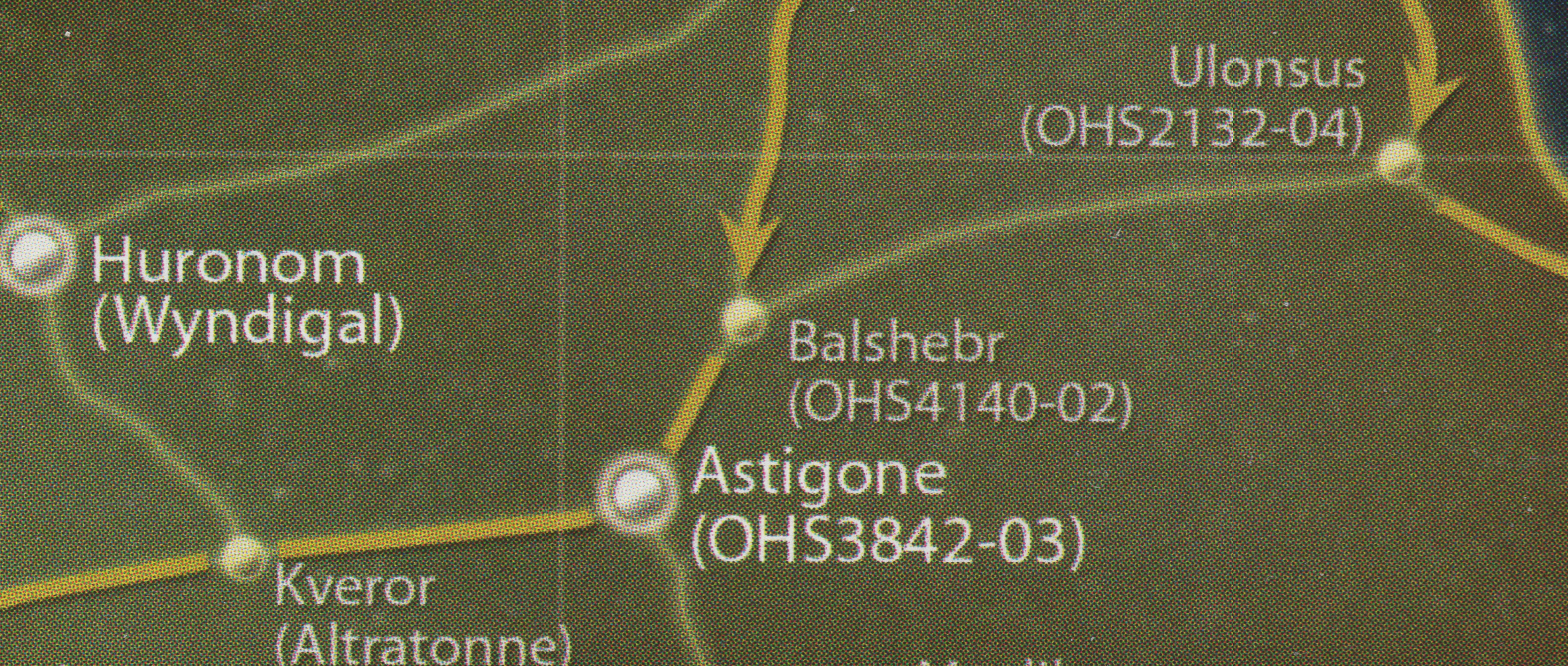 The OHS4140-02 system was located in the Ash Worlds sector,[1] a part of the Slice portion of[2] the Outer Rim Territories.[1] Between 25,120 BBY and 25,096 BBY, it was known as the Balshebr system and was situated in the Kiirium Reaches region, a part of the empire of the Tionese conqueror Xim. During that time, the Balshebr system was connected by hyperlanes to the Astigone, Dellalt, and Ulonsus systems, and Xim moved his forces from the Dellalt system to the Balshebr.[2]