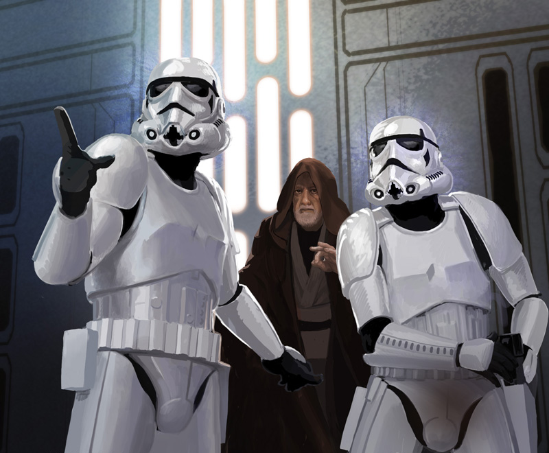 Obi-Wan Kenobi uses the Jedi mind trick on a pair of stormtroopers aboard the Death Star