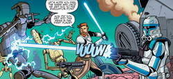 Kenobi was able to duel Grievous to a draw in their third and fourth encounters, and was able to overpower him in their second duel and ultimately killed him in the final round, albeit with a blaster rather than his lightsaber. However, his final victory may have been helped by Grievous' fresh injuries, which would have hampered the cyborg's fighting abilities.[10] Although Kenobi usually used only one lightsaber, he also seemed to have been well-versed in the art of Jar'Kai, which was perhaps most prominently displayed during his duel with Maul and Savage Opress, in which he wielded both his own lightsaber and the blade of the slain Adi Gallia. His mastery of dual-blade combat allowed him to hold his own against both the Sith brothers, and he even managed to break Opress's left knee and sever his left arm. The duel ultimately ended as a stalemate when an angered Maul used his Force powers to briefly incapacitate Kenobi, giving the brothers time to escape.[131]