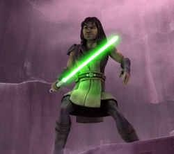 Around 45 BBY,[20] Jedi Master Qui-Gon Jinn chose Kenobi as his Padawan learner when he was twelve years old. During his apprenticeship he became friends with Jape, a fellow Padawan who he kept correspondence with, and also maintained contact with crèche-mate Prie[16] and the Mon Calamari Bant Eerin.[21] In their first months together, Jinn attempted to adapt his teaching methods to suit Kenobi's strengths, but felt he failed to do so adequately.[16] At some point during his training, Kenobi constructed his first lightsaber, modeled after Jinn's lightsaber hilt style and his own personality.[22] As the pair struggled to establish a workable affinity, the Master continued to train his Padawan in the basic cadences of lightsaber combat, preventing him from picking a specialty.[16] Jinn was proud of his apprentice's skills, and sparred with him in training sessions[9] while at the Temple between missions. Kenobi, in turn, spent a significant amount of time in the training dojos to hone the techniques taught to him.[16]