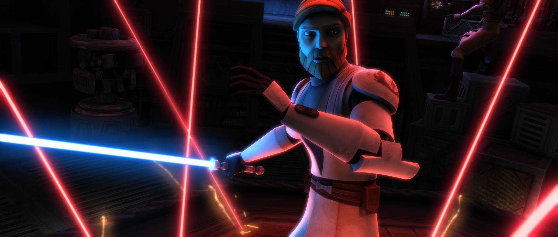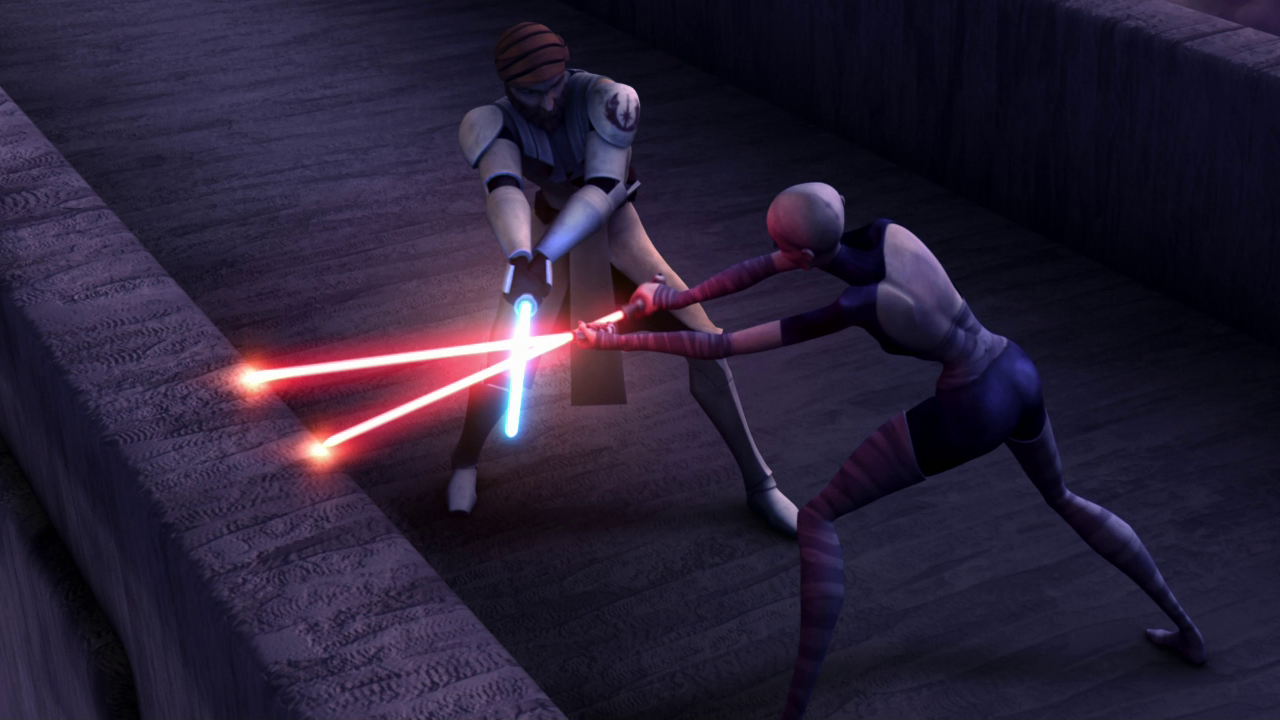 Kenobi and Ventress engage in lightsaber combat