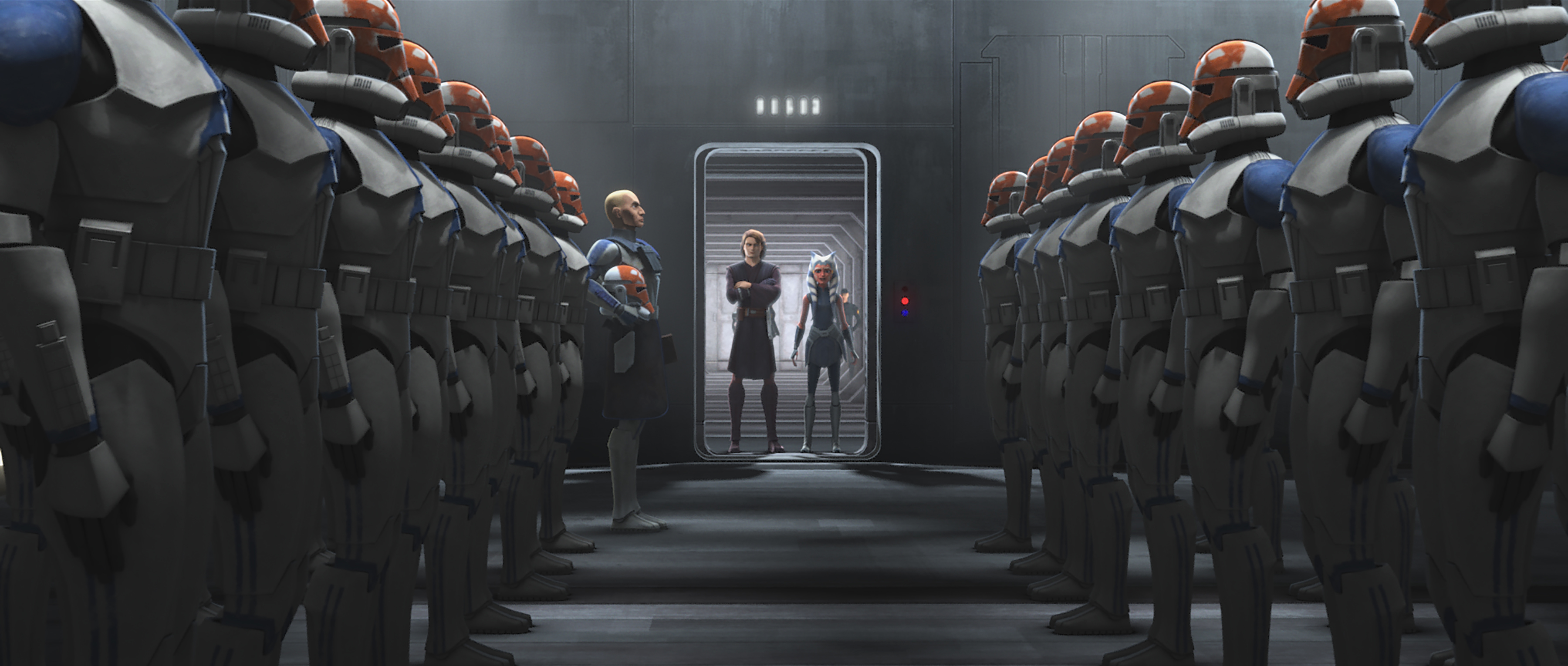 After Bo-Katan and her guards have left, Tano speaks with Skywalker in private, telling him that he and Kenobi have not changed. When Anakin asks if that is a bad thing, she remains silent, but smirks at him. Skywalker tells his former Padawan that he has a surprise for her and leads her through the ship. Passing 212th clone troopers salute her, surprising Ahsoka, who no longer regards herself as a Jedi.