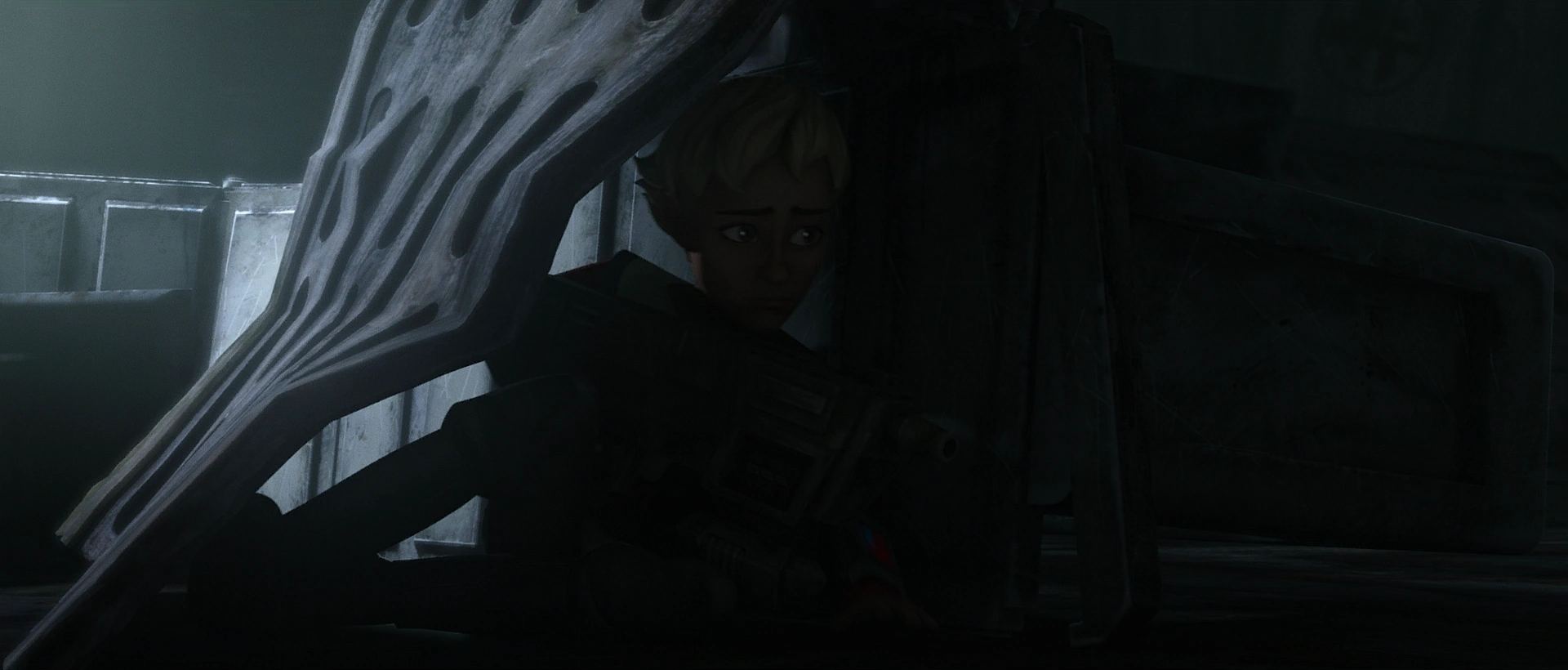 Omega followed as Rex led the group inside the ship, avoiding the patrols of the local group in power, the Scrapper Guild. They eventually located the medbay, but as Wrecker prepared to be the first to be treated, his chip activated. After knocking out Tech, he chased Rex, Echo, and Hunter out of the room, with Omega staying as instructed to look after Tech. However, Omega decided to grab Wrecker's blaster and fire at him. As Wrecker had incapacitated the other three, he chased after Omega. She slipped underneath a door, but Wrecker forced the door open with ease due to his considerable strength. Omega tried to hide, but she was discovered. However, she was saved by Rex, who stunned Wrecker just as she was discovered.[10]