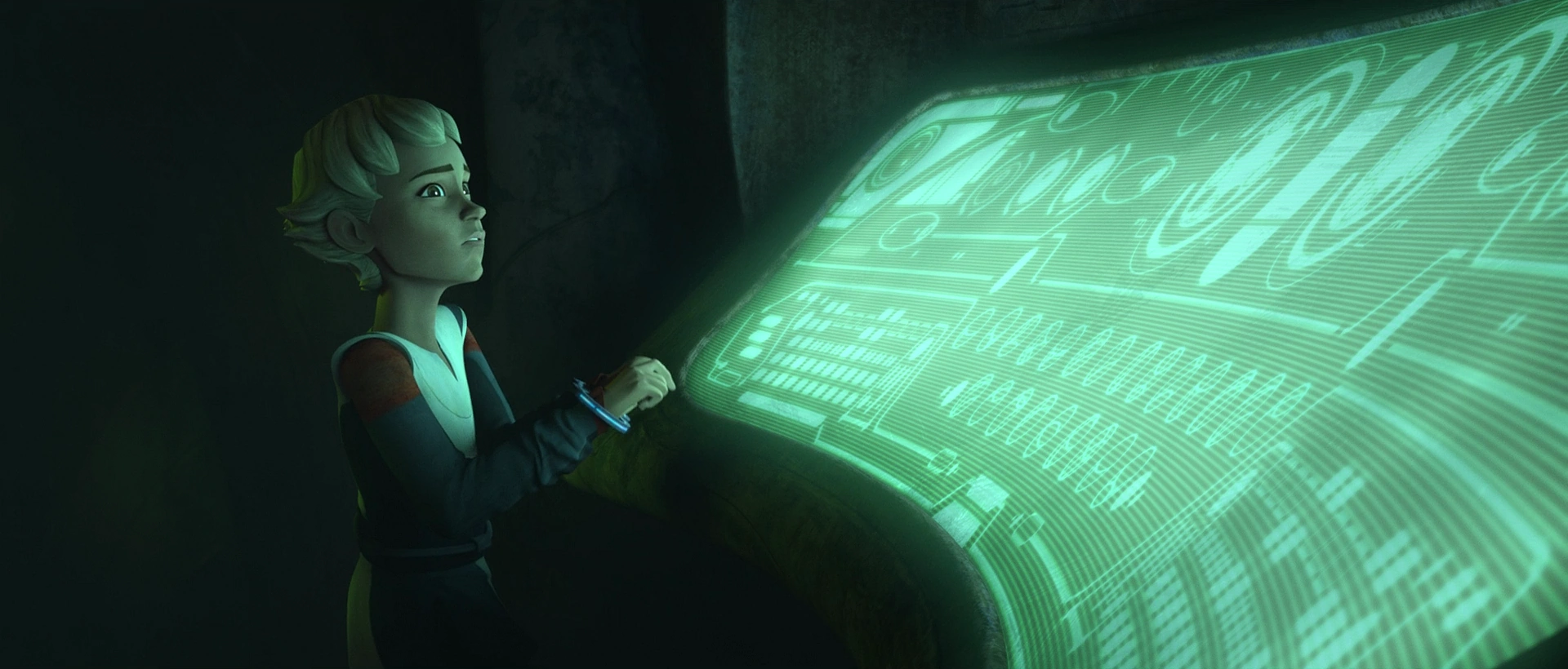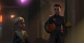 When Tech communicated to Hunter about his plan for them to intentionally get their ship impounded so they could get inside the complex, Hunter was angry but Omega approved of the plan. Although Tech did not plan for Omega to be onboard when they were impounded, they stayed together in the ship while Echo snuck in and stole chain codes for Tech to forge. When clone forces amassed near the ship, preventing Echo or Tech from passing the codes to Hunter, Wrecker, and the family, who had entered the spaceport and planned to pick them up before boarding the last shuttle, Omega grabbed the codes and snuck out herself to deliver them, succeeding in bringing them to the group.[5]