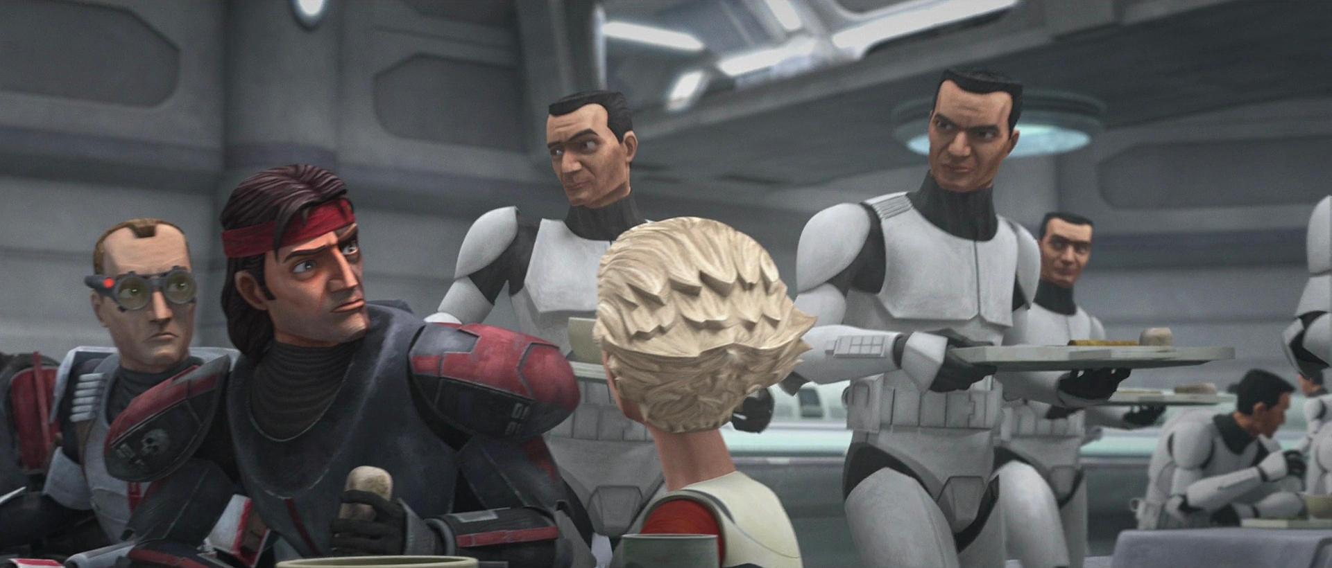 Determined to grow closer to the Bad Batch, Omega sat with them in the mess hall, which Tech noted was something that had never happened before. Unaware of her true nature as a clone, Hunter asked where her parents were. Omega barely had time to respond to the alien term when another clone trooper made a passing remark about the "Sad Batch." Taking offense, Omega threw food at the clone and demanded he apologize. Hunter, the group's leader, tried to de-escalate the situation, but Wrecker threw an entire tray of food at the clone trooper and triggered a brawl. Omega later tried to claim responsibility for the incident when the Bad Batch were called in for punishment, but Hunter refused, giving her a warning to stay away from their squad to avoid getting herself in trouble.[1]