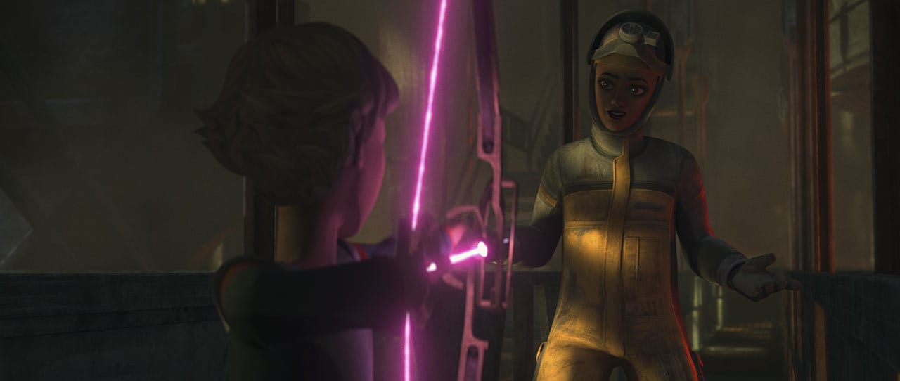 The group landed and infiltrated a facility that was scrapping battle droids. Once they snuck past the police droids and got inside, Hunter stationed Omega and Wrecker as lookouts while he, Echo, and Tech moved in. Echo accessed a computer to discover that there was only one tactical droid inside, which Omega was able to spot on the conveyor belt. However, another individual disguised as a worker went in and stole the head. Omega alerted the others of this development before she found herself face-to-face with another person, Rafa Martez. Omega quickly drew her bow, causing Rafa to freeze and put her hands up. However, Rafa convinced her to lower the bow and talk it out, and when Omega did, Rafa knocked the bow out of her hands. The bow managed to discharge a single bolt that ruptured a steam pipe, alerting the facility workers to their presence. Rafa communicated with her sister Trace, who had the droid head, and as she went to meet up with her, Omega gave chase and told Hunter she was in pursuit. Meanwhile, the rest of the Bad Batch fought back against the police droids that began advancing on them.[9]