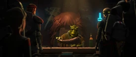 Omega later stood by Nala Se's side as she and Prime Minister Lama Su attempted to convince Admiral Wilhuff Tarkin to consider the Bad Batch an asset to the new Galactic Empire. However, Tarkin was more concerned about the squad's tendencies to disobey and disregard orders, especially since they failed to execute Order 66. Though she failed to comprehend most of what she overheard, Omega got the impression that Tarkin didn't trust clones and tried to warn Hunter as the Bad Batch was about to depart on a mission to Onderon but he dismissed her concerns. Nonetheless, she insisting on joining him, suspecting that it was no longer safe on Kamino, but Hunter replied that change took time to get used to and left.[1]