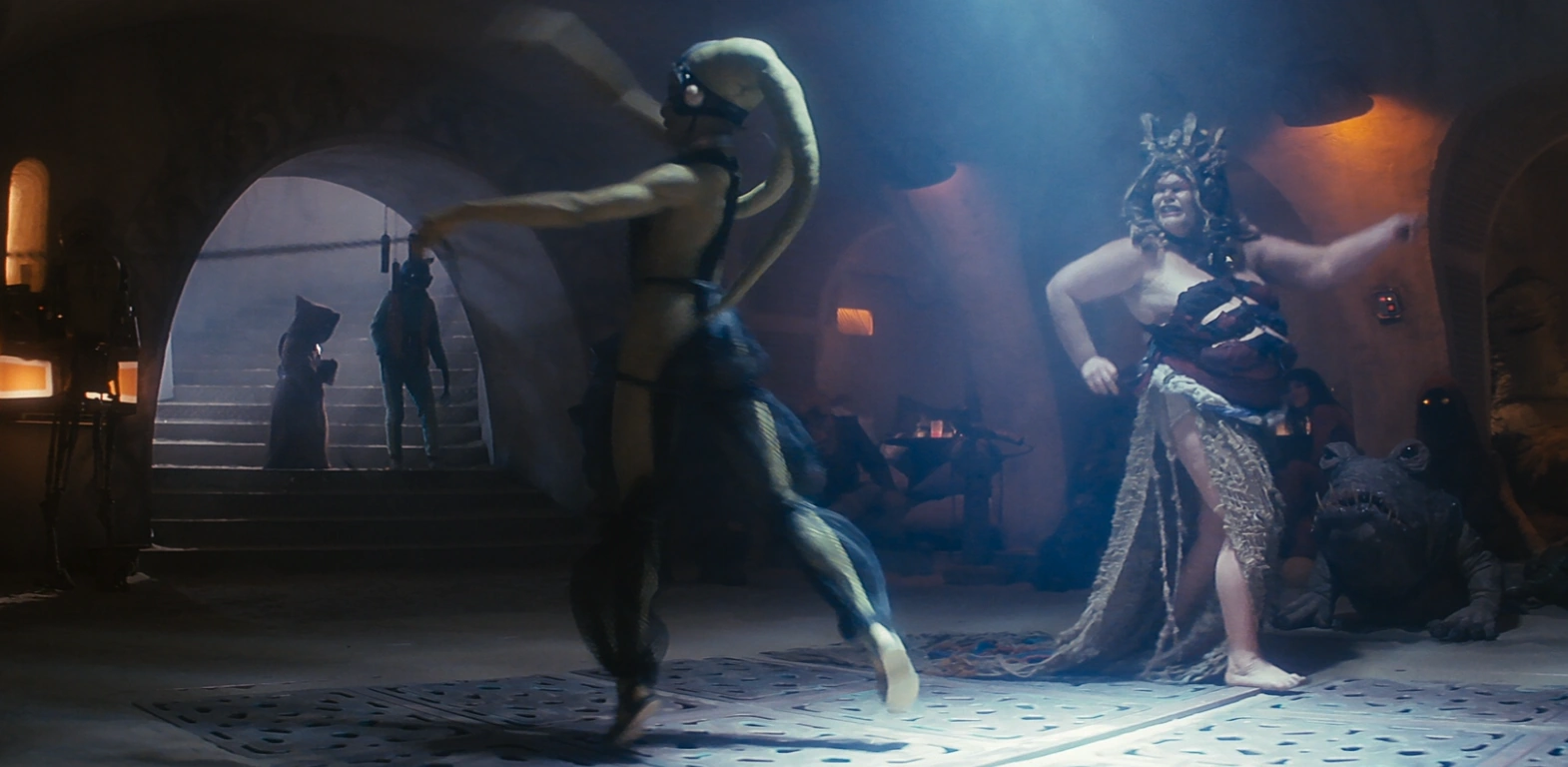 Shortly before Princess Leia Organa and the Wookiee Chewbacca arrived as part of the plan to rescue Solo, the Max Rebo Band performed for Jabba and his court. Oola and Gargan[3] gracefully[5] danced together to the song in front of Jabba's throne, and when it ended[3] the Hutt demanded Oola repeat her performance. Misinterpreting this as an order directed at them, the band began playing an improvised version[8] of the song "Jedi Rocks."[18] Oola and Gargan once again began to dance,[3] but wanting to bring the Twi'lek closer, the Hutt brutally yanked the chain attached to Oola's collar.[5]
