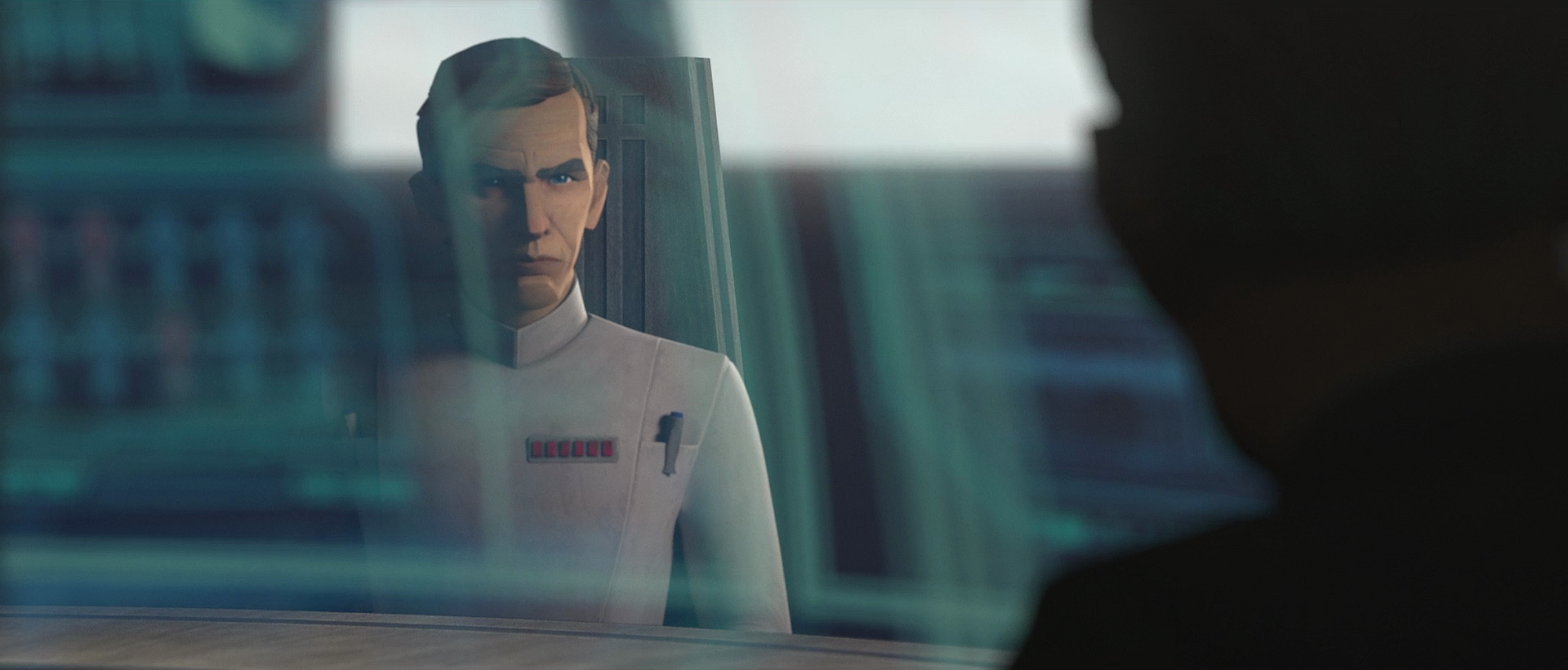 Krennic met with Grand Moff Tarkin, Grand Admiral Thrawn, and the Emperor himself (who appeared via hologram) as well as Grand Admiral Balanhai Savit aboard the Firedrake (Krennic, Tarkin, Thrawn, and the Emperor's hologram, pictured).