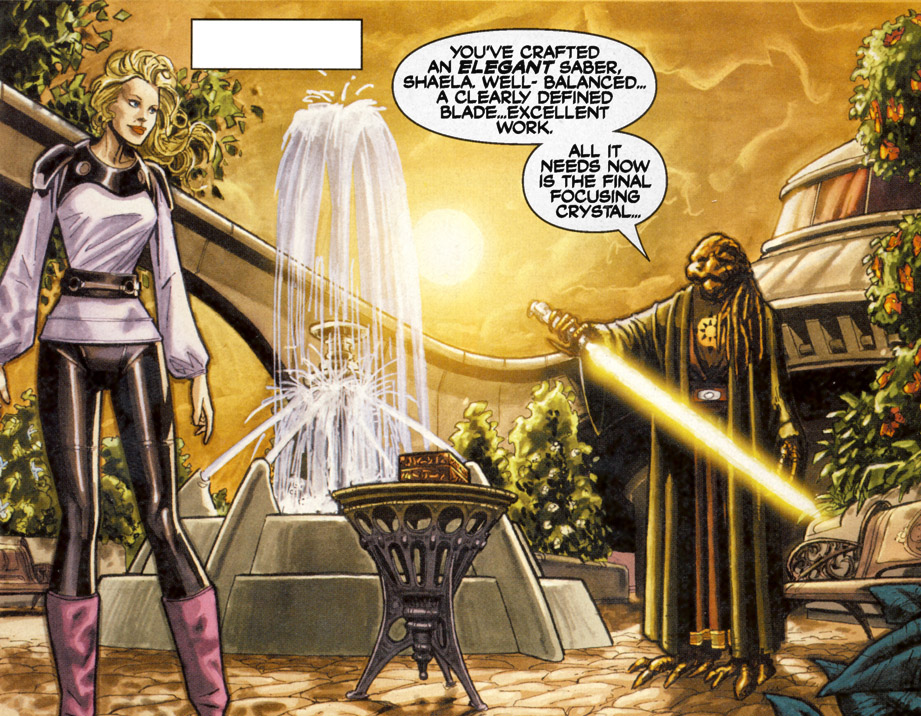The Jedi were forced to hastily evacuate the planet, and it was during the ensuing chaos that Kun returned with his Sith apprentice Ulic Qel-Droma and a team of Massassi warriors, determined to loot the planet of its riches. Qel-Droma's Mandalorian Crusaders dived into the fray too, firing on the ships of the fleeing Jedi. Kun attempted to take a valuable collection of ancient lightsabers, but was stopped by the Neti Jedi Master Ood Bnar. Bnar transformed himself into a tree, trapping the lightsabers underneath his roots and preventing Kun from reaching them.[29]