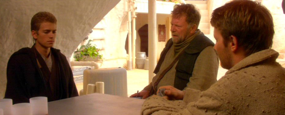 While shooting Episode II in Tunisia, Edgerton filmed a scene for Episode III in which he is delivered the infant Luke by Obi-Wan, played by an stand-in actor rather than Ewan McGregor, as Lucas didn't desire to return to Tunisia for that single shot years later. However, the scene was changed during the Episode III shoot in September 2003, where McGregor playing Kenobi was filmed handing baby Luke to Bonnie Maree Piesse playing Beru, this time with Owen being played by an stand-in as Lucas "felt it would be better if Luke were handed over to a woman". Anyway, Edgerton was shot and added to the scene almost a year later.[36]