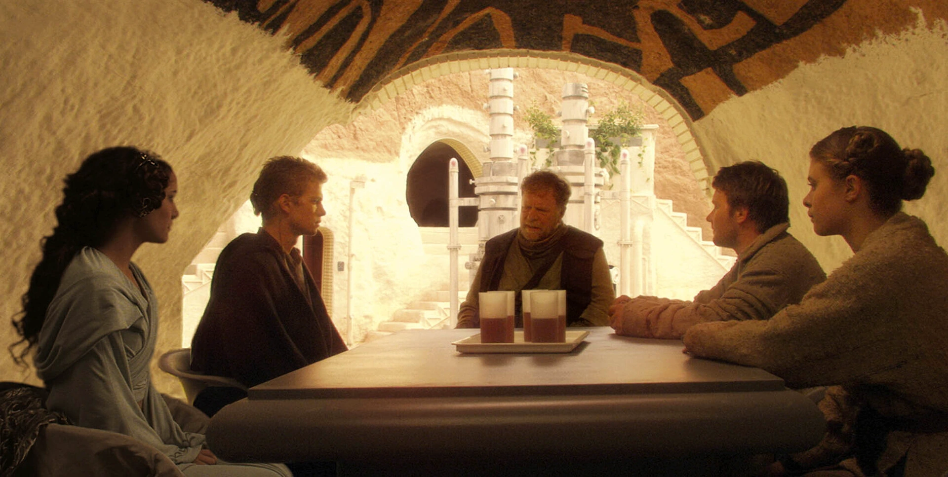 The Lars family tells Anakin Skywalker about Shmi Skywalker's abduction.