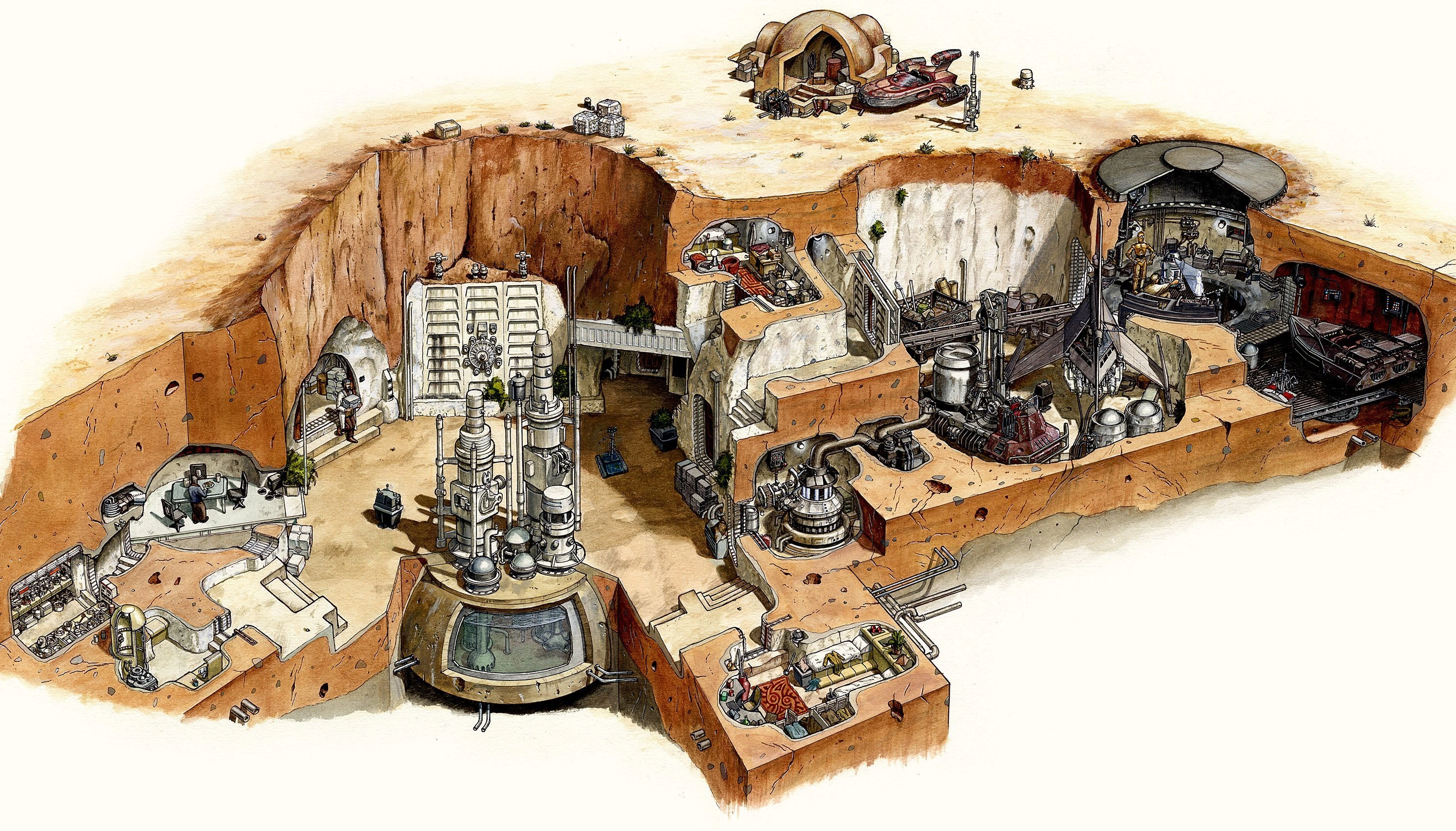 When the morning came, Lars could not find his nephew, so he asked his wife if she knew where he was. Beru believed that Skywalker was doing chores, but in actuality, Skywalker was searching for R2-D2, who had run off in search of Kenobi. Unknown to Lars, R2-D2 was carrying stolen plans of the Death Star, the Galactic Empire's recently completed superweapon capable of destroying entire planets. Imperial stormtroopers, desperate to reclaim the data, traced the droid to the Lars homestead, where they proceeded to interrogate Lars and Beru. Failing to acquire the plans, the stormtroopers killed the couple, burning the home and leaving.[15] When Skywalker returned, finding his family murdered and home in ruins, he decided to leave Tatooine with Kenobi and train to become a Jedi Knight like his father. The pair traveled to the Mos Eisley spaceport, where they met Han Solo, a smuggler who agreed to take them to the planet Alderaan aboard the Millennium Falcon.[3]