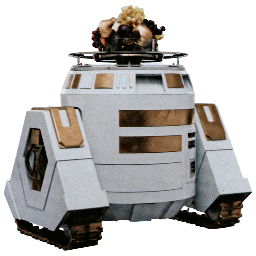 PA-LT4 was a white and gold plated A-LT Utility Droid that was owned by the criminal Crimson Dawn syndicate during the reign of the Galactic Empire.[1] In 10 BBY,[3] it was one of a team of droids serving food in the lounge of the First Light, a yacht owned by Crimson Dawn's leader Dryden Vos.[1] As the vessel landed on the planet Vandor,[4] PA-LT4 had a fresh fruit assortment in the temperature-controlled serving tray atop its body and did its best to remain inconspicuous and not get underfoot. The droid was equipped with two precision engineered traction treads.[1]