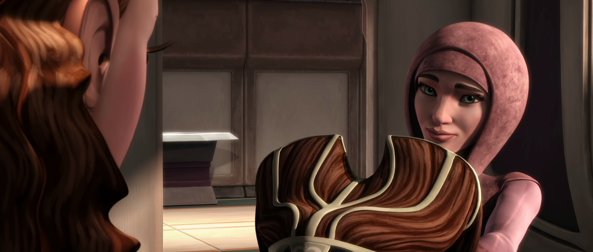 Handmaiden Teckla Minnau presents Senator Padmé Amidala with one of the hairpieces from the wardrobe.