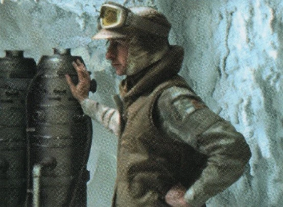 During his service at Echo Base, Torshan donned the cold-weather armor standard of the Rebel personnel on Hoth. His outfit included the set's headgear, anti-glare goggles, padded vest, lightweight tunic,[1] gloves,[6] leggings, and boots.[7]