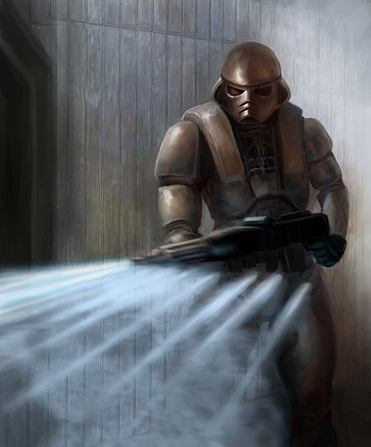 The Phase II dark trooper was intended to be used either as an artificially intelligent droid or exoskeleton—either way, it was extremely effective in battle. A small number of these soldiers destroyed a Rebel base on Talay.