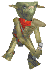 After being mutated, Pic was an unpleasant creature. He was extremely lively, and some described him as evil:[10] he liked killing, and often mocked those he had captured. The only person he seemed to actually care about was Gorc. Being in such close proximity to him, combined with the ability to see into his mind, Pic's bond to Gorc was more than just a dark side connection—it could almost have been described as a friendship. Gorc was dim-witted and slow, so Pic tried to look out for his companion's well-being. Even though he was the smaller of the two, Pic acted as a sort of "older brother" to his mutated friend.[2] He became angry when people abused Gorc,[1] and could usually be found hanging from Gorc's shoulders, often jumping from one to another.[3] Pic did all the talking; Gorc seemed barely capable of saying anything more than a grunt,[1] and preferred to remain quiet anyway.[10] In return for his kindness, Pic was given a miniature set of Gorc's red-brown M'uhk'gfa armor, which the Gamorrean had crafted himself, though without the dark helmet that Gorc chose to wear.[2]
