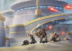 During the Clone Wars, several Republic supply ships were destroyed by pirates en route to Rodia.[11] Later the pirate gang of Captain Hondo Ohnaka captured Separatist leader, Count Dooku on Vanqor. They attempted to ransom Dooku off to the Republic.[3] They tried to triple the ransom by capturing Jedi Master Kenobi and Jedi Knight Skywalker. However, Dooku escaped and Kenobi and Skywalker were rescued by Representative Jar Jar Binks and Clone Commander Stone's troopers.[12] The Ohnaka Gang would continue in their operations such as extorting nysillin from farmers on Felucia,[13] smuggling weapons to known resistance movements,[14] and attempted to steal Kyber crystals from a group of Jedi younglings.[4]