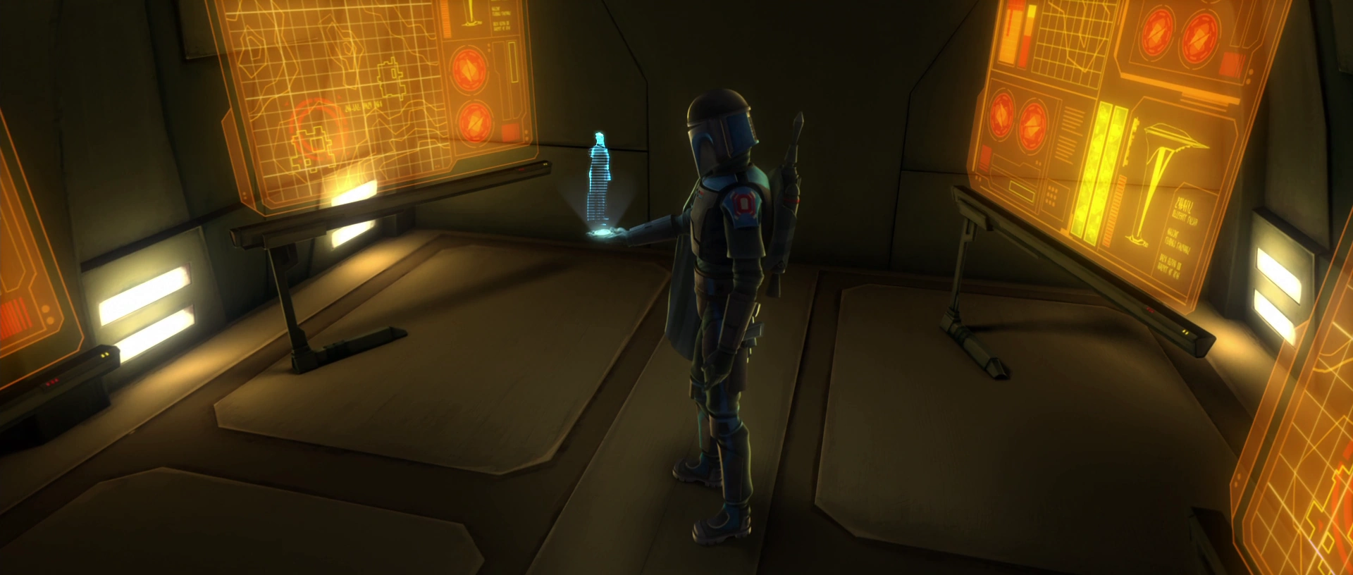 Concerned by the presence of the Jedi on Mandalore, Vizsla contacts Count Dooku for advice.