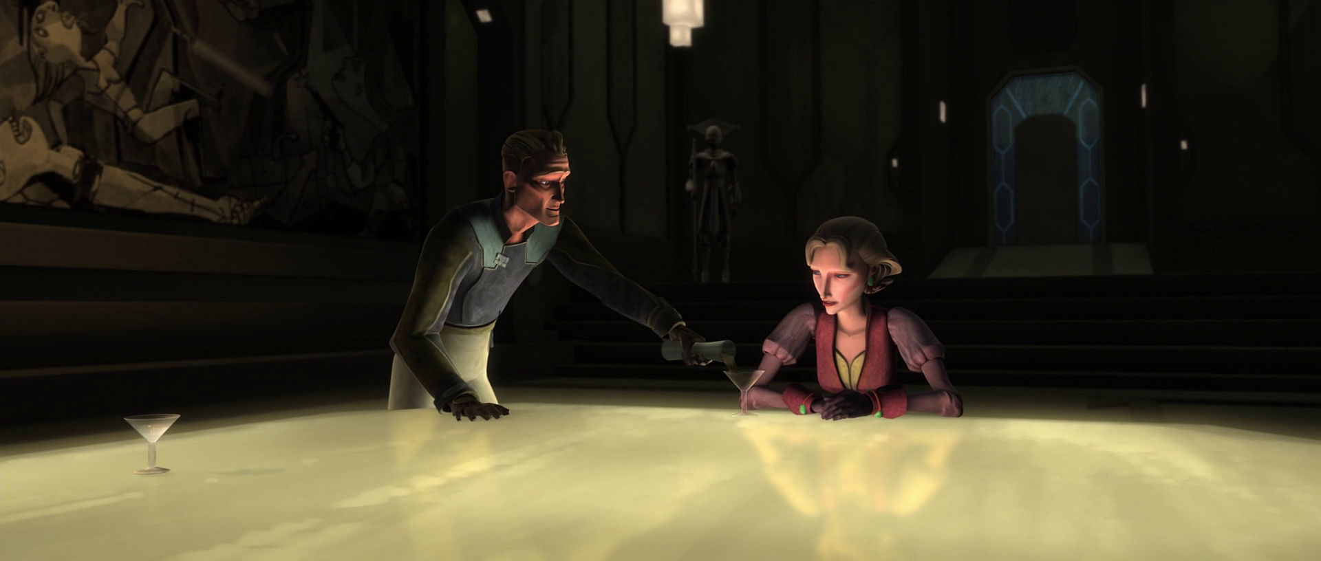 Kryze joined Vizsla in the dining room and explained Kenobi's absence by lying that he had gone to meditate. As Satine explained the situation she was in, Vizsla prepared drinks for themselves. She told him that she suspected someone was feeding misinformation directly to the Republic Senate, and asked who would gain anything from such lies. Vizsla replied that it had to be the Death Watch, but Kryze refuted him and stated that the Death Watch was incapable of engineering such political intrigue without help from an external force. Recognizing that her suspicions were correct, Vizsla commented that it was hard to believe, given that it could only have been someone among the highest influence in the Separatists. Satine asked why they would target her, and Vizsla explained that she threatened the Separatists' goals as the leader of the Council of Neutral Systems. He joked that she should take the campaigns against her as a compliment since it meant someone powerful was seeking her downfall.[7]
