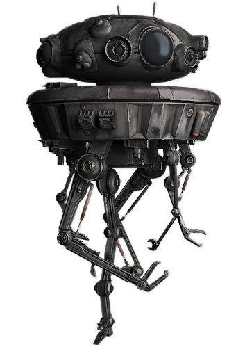 A probe droid, also known as a recon droid, probot, or Sensor Droid, was a type of droid that could be used for deep space exploration and reconnaissance. They were tenacious hunters and searchers and used manipulator arms to perform various tasks. Notable models included the DRK-1 Dark Eye probe droid and the Viper probe droid. They could be equipped with both shields and blasters.