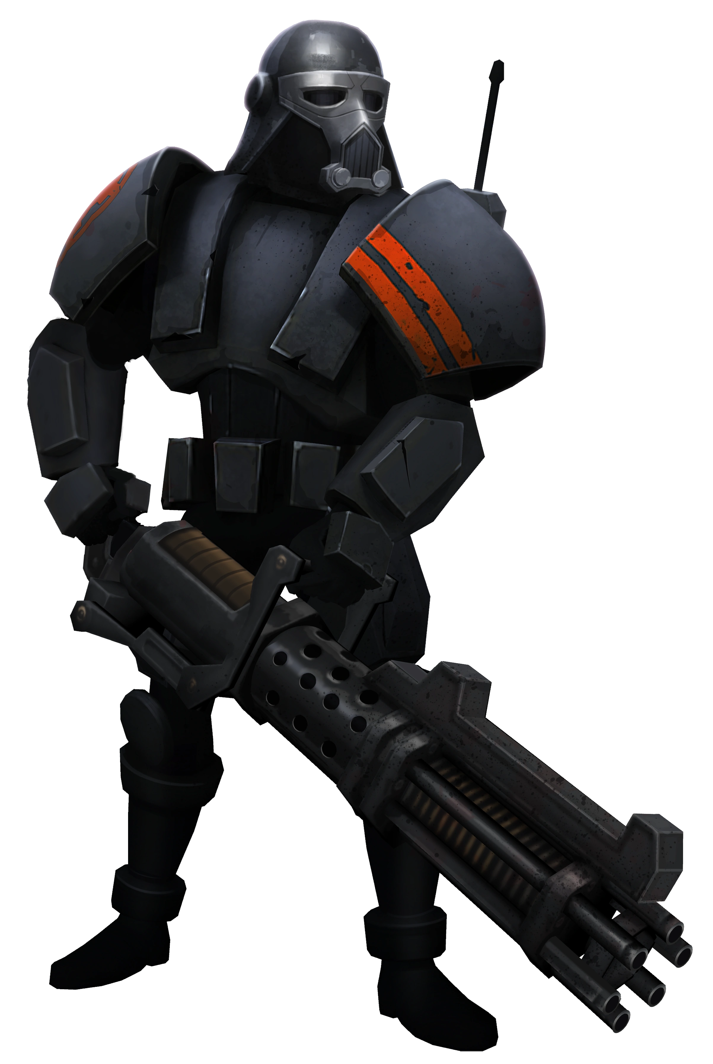 Purge Troopers were equipped with heavy armor. They carried a variety of weapons in their arsenal, such as flamethrowers, rocket launchers, heavy blasters, and sniper rifles.[1]