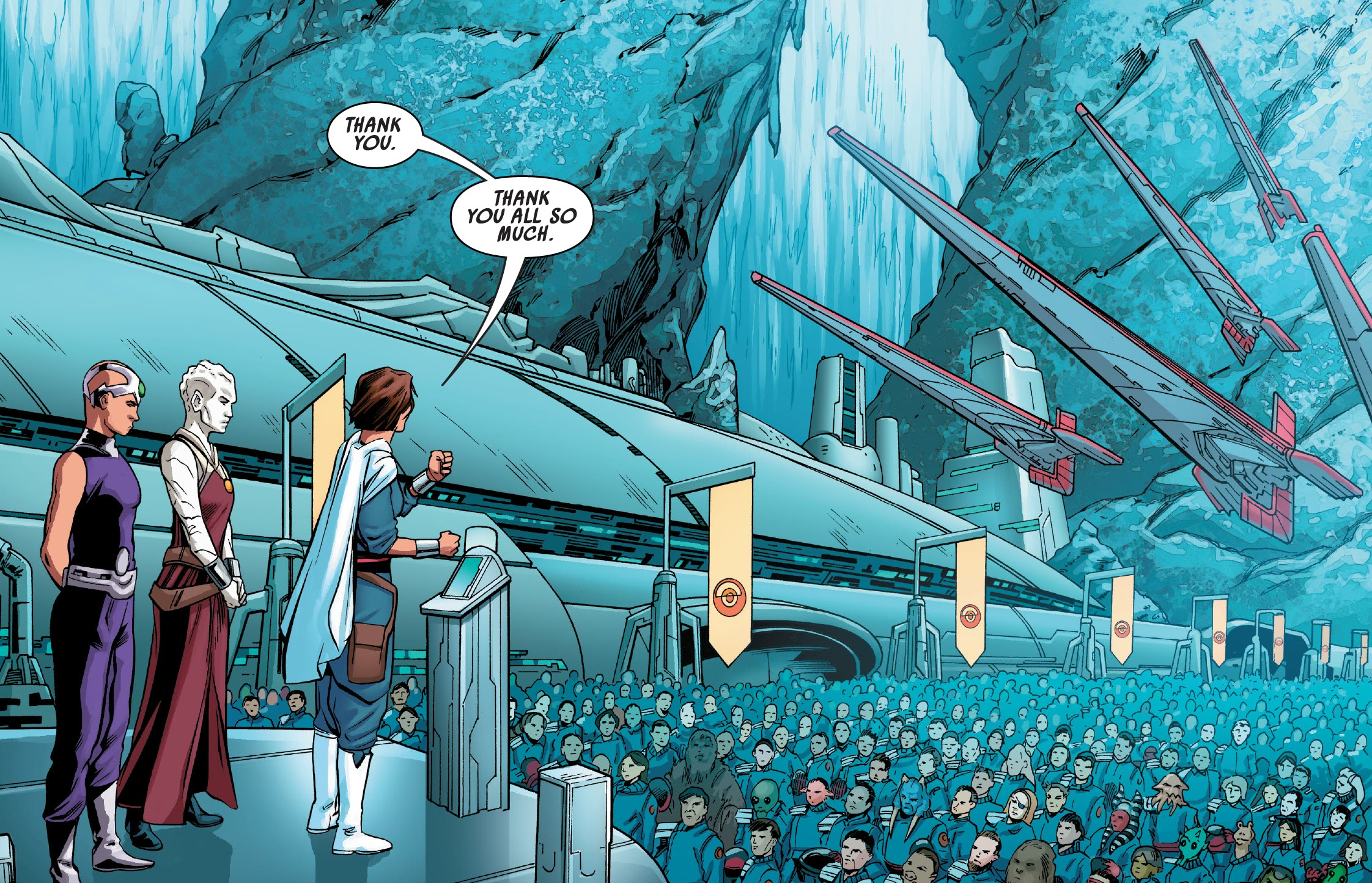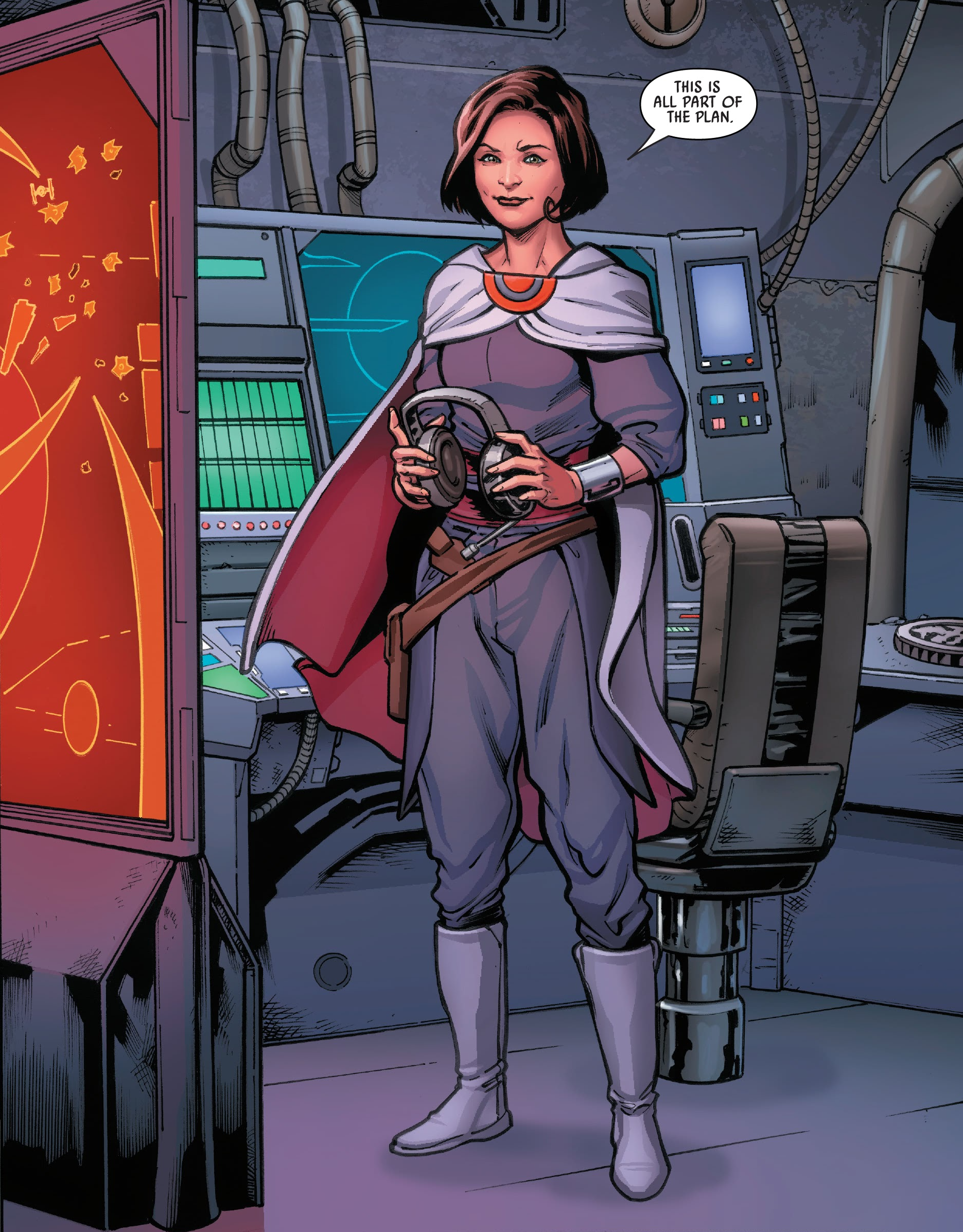 Shortly after, Qi'ra arrived at Home One and met with Leia again. Qi'ra told her that Commander Ellian Zahra had wiped out most of the Rebel Alliance's fleet divisions and that she would give Leia the location of the last surviving one. When Leia asked Qi'ra why she was telling her this, Qi'ra said she preferred to make friends instead of enemies. Once Leia accepted Qi'ra's aid, Qi'ra asked her where Chewbacca was. Leia then took Qi'ra to a room where Chewbacca was using training remotes to prepare himself for breaking Solo out of Jabba's Palace. Qi'ra recommended that Leia take him with her to help them rescue the last division. She then offered Leia another gift; Zahra and her entire hunter squad. Qi'ra explained that she had an operative who would make sure Zahra and her group were exactly where Leia wanted them. Qi'ra went on to offer Leia one final gift; handling the Rebel Alliance's supply chain. Leia accepted Qi'ra's gifts and told her to coordinate the specifics with Holdo. Qi'ra then wished Leia luck in finding the last division before departing in the Vermillion.[45]