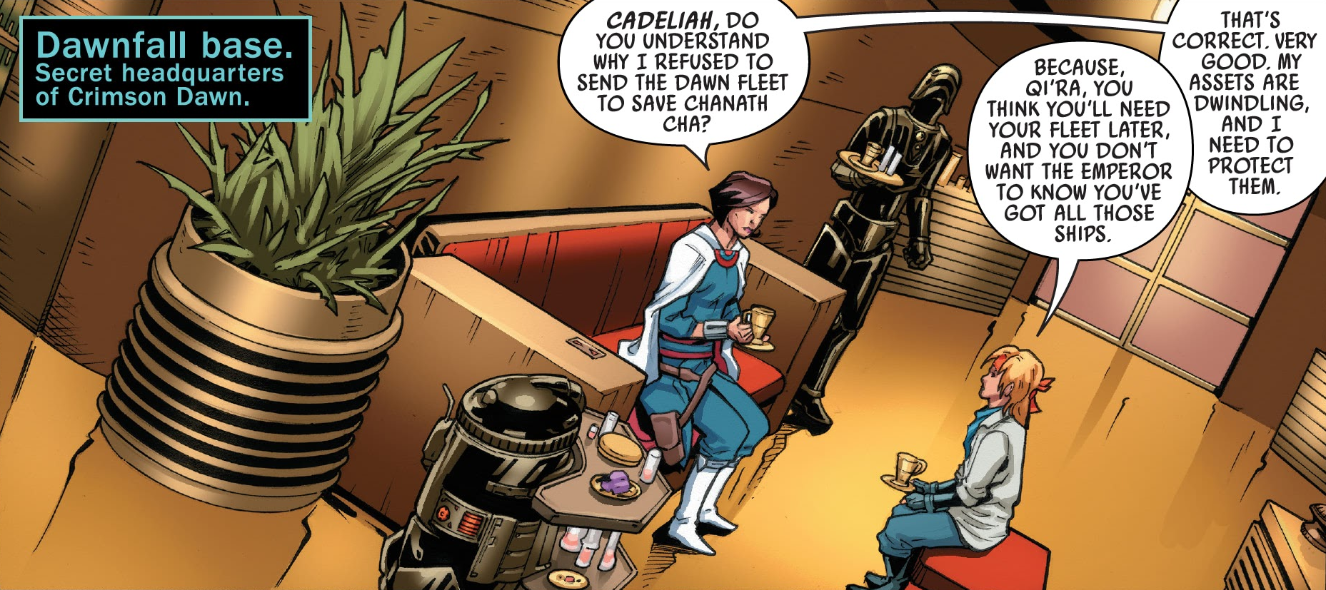 "Despite Palpatine's best efforts, all his purges of my agents and threats to my allies…I am not completely without resources. I am Lady Qi'ra of Crimson Dawn. People will take my call." - ―Cadeliah and Qi'ra
