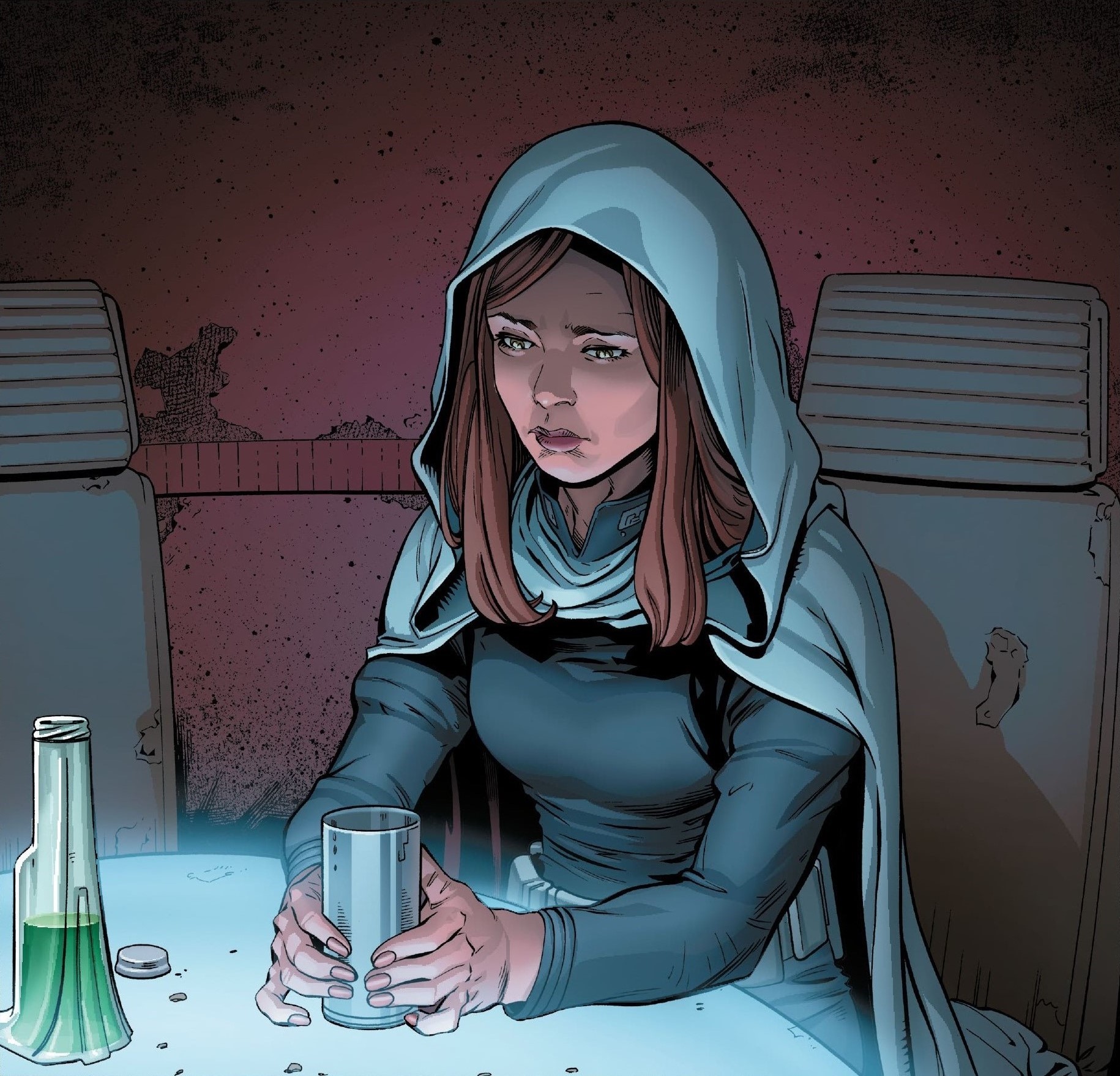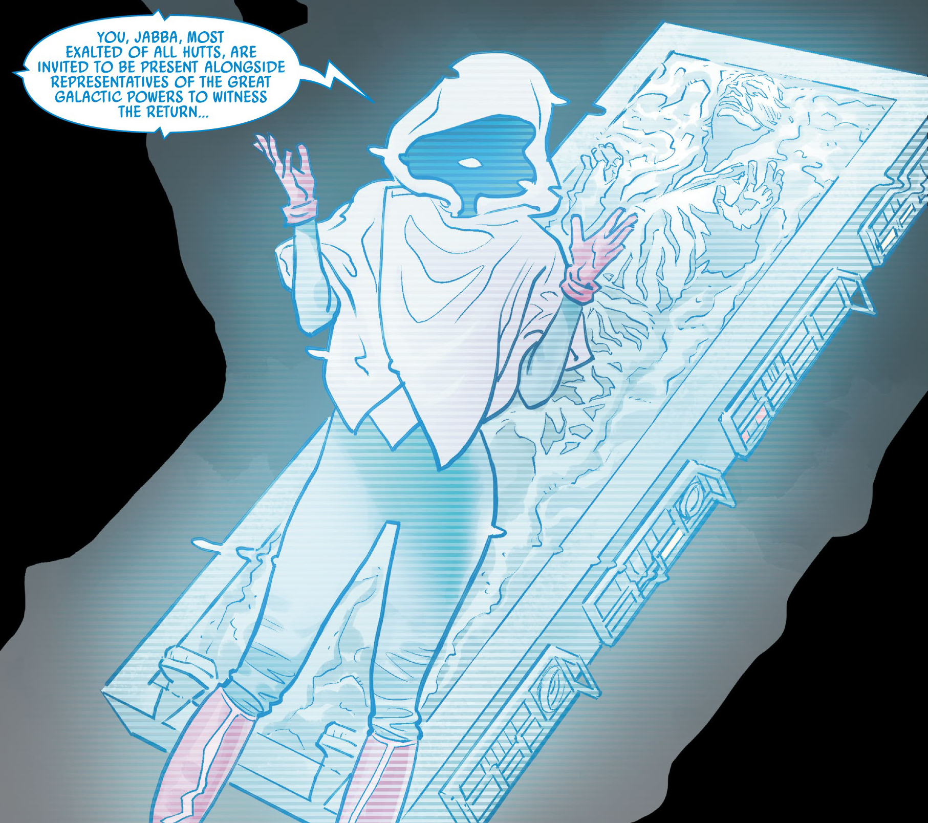 With her hood covering her face to keep her identity secret, Qi'ra's hologram message was sent out to various parties, including crime lord Jabba the Hutt on the planet Tatooine and the rest of the Grand Hutt Council. In her message to Jabba, she announced the return of Crimson Dawn but claimed they would cause no friction with the galaxy's major powers, inviting him to the frozen Mid Rim planet Jekara and offering Solo as a gesture of good will. As Jabba traveled to Jekara aboard his Shad'ruu war barge, Fett—who had received a bounty on his head after Jabba mistakenly believed he had sold Solo to Crimson Dawn—also began to journey to the planet after viewing the message Jabba received. Her message was also received by Sana Starros and Doctor Chelli Lona Aphra.[20]