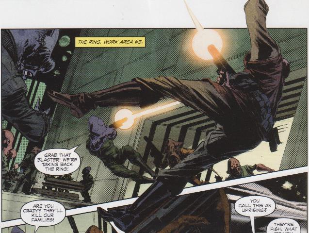 One Quarren named Tikin befriend a Mon Calamari environmental engineer named Luen. These two encountered the Imperial Knight Jao Assam and the junk dealer Ania Solo, who learnt about their predicament and quickly transmitted word of the pirates and their slaving operation to the Triumvirate authorities in Coruscant.[26] Later, Tikin was murdered by Darth Luft and his death triggered a slave uprising by the Quarren and Mon Calamari, who joined forces to rebel against the pirates.[27] This uprising coincided with an attack by the Galactic Triumvirate led by Admiral Stazi and the Imperial Knight Yalta Val, who liberated the slaves and apprehended the pirates. Darth Luft himself was killed during a duel by Jao Assam. The Quarren and Mon Calamari then settled in the space station, which had been flooded with water by Admiral Stazi, to provide a comfortable atmosphere for the former slaves. As a gesture of reconciliation between the Quarren and Mon Calamari, Tikin's son Tilin was raised by Aunt Luen.[28]
