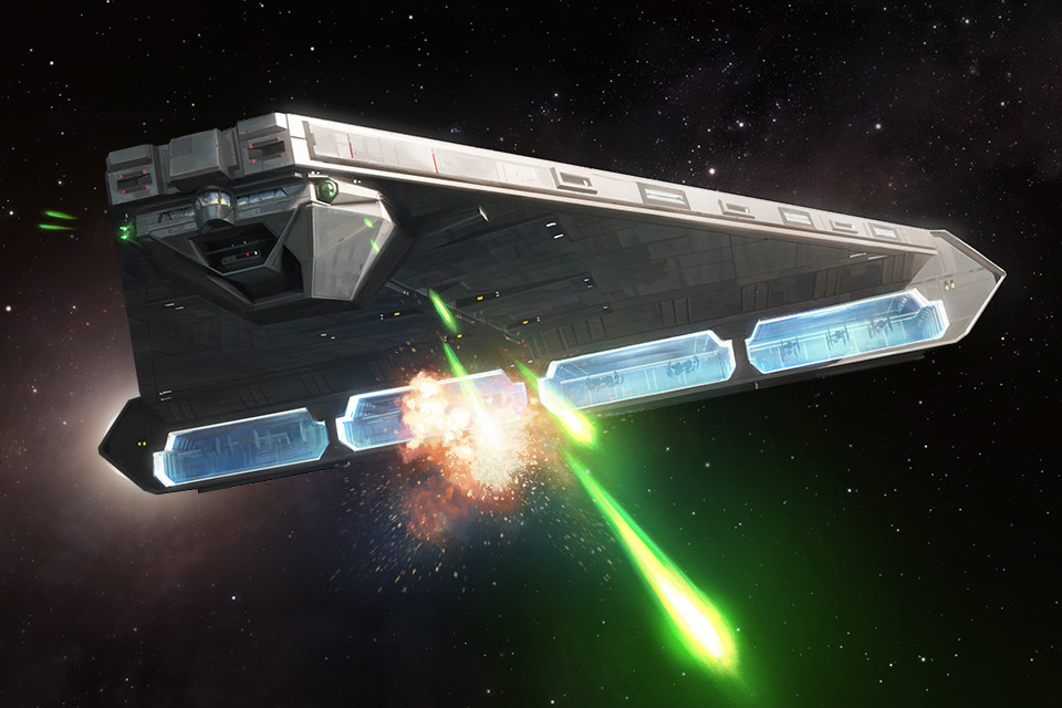 The Quasar Fire-class cruiser-carrier[2] was built by the SoroSuub Corporation,[1] a Sullust-based shipwright corporation.[10] Its triangular structure made it similar to other dagger-shaped Imperial spacecraft, including Star Destroyers. Unlike Star Destroyers, however the bridge was located at the frontal point and the hangars at the base.[7] The structural integrity of the Quasar Fire spaceframe was questionable, being subject to micro-fractures while reverting from hyperspace to realspace. This much was alleged by a report issued by Mid-Rim Shipwrights.[11]